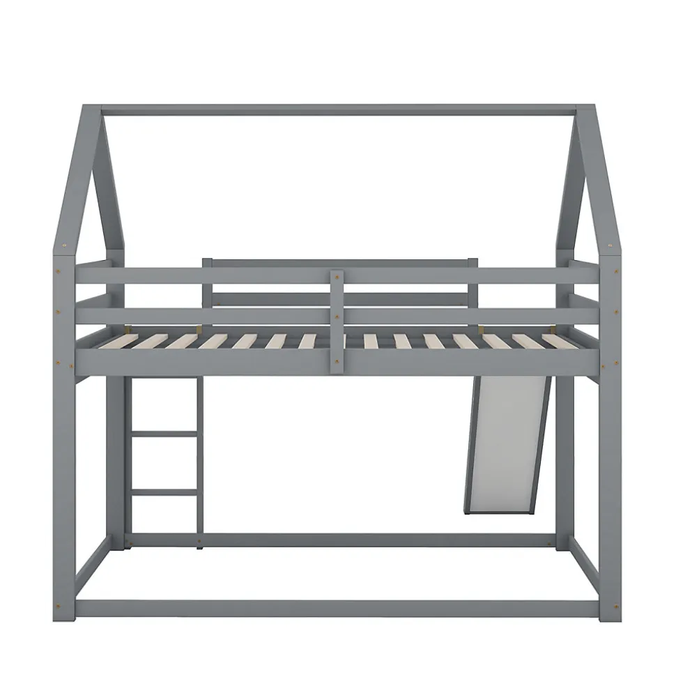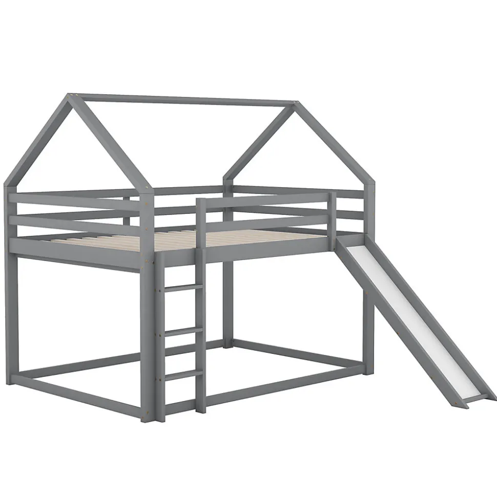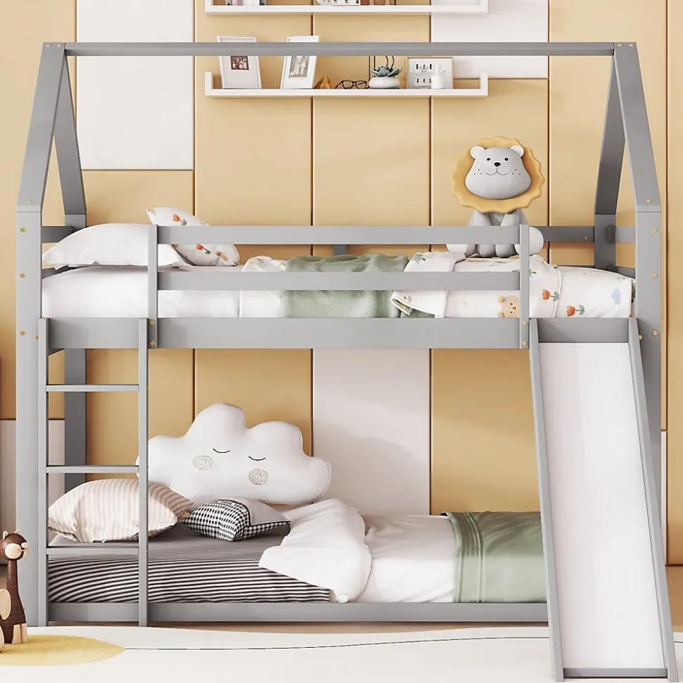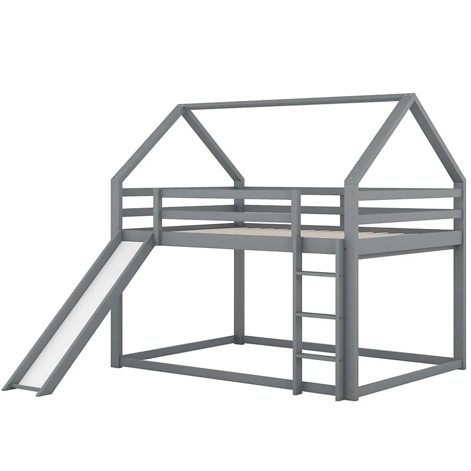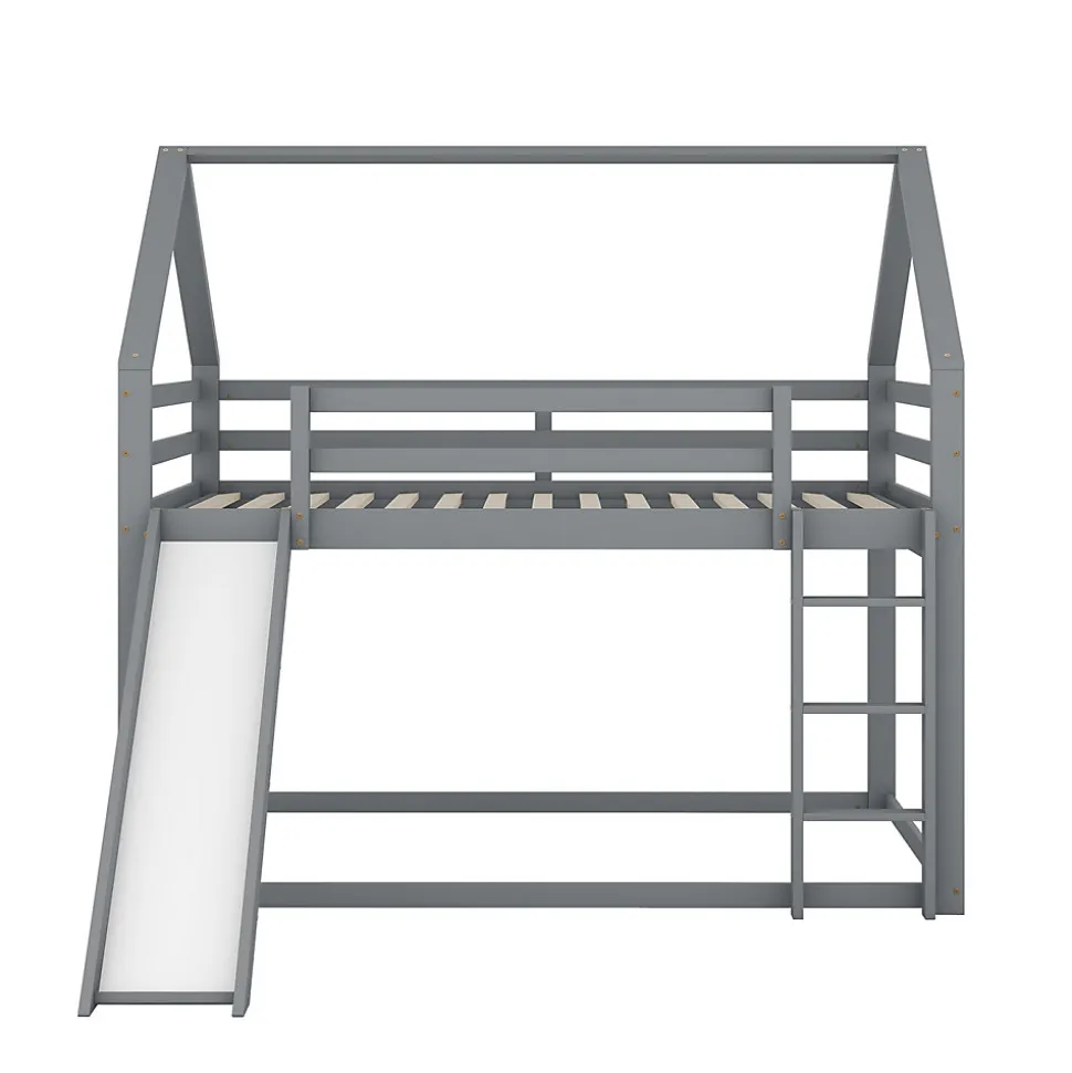 [Lit cabane avec toboggan] Ce lit, en forme de cabane originale, apporte une touche ludique à la chambre de votre enfant. Il est équipé d’un toboggan pour son plus grand plaisir. Il offre à votre enfant un espace pour dormir et s’amuser au lit. [Surface de couchage de 140 x 200 cm] Les deux lits, supérieur et inférieur, offrent une surface de couchage de 140 x 200 cm. Votre enfant aura ainsi plus d’espace pour bouger et deux enfants pourront dormir confortablement ensemble. Si votre enfant invite un ami à la maison, ce lit sera largement suffisant ! [Sécurité enfant] Le lit inférieur est plus adapté aux jeunes enfants et réduit les risques de chute. Le lit supérieur est équipé d’une barrière de sécurité robuste pour empêcher les enfants de tomber. Les enfants peuvent facilement accéder au lit supérieur grâce à l’escalier, ce qui renforce également la stabilité du lit. La position de l’escalier et du toboggan est réversible. [Cadre de lit en bois de haute qualité] Fabriqué en pin massif et MDF, ce lit superposé est conçu pour durer et solidement fixé par des vis robustes pour une stabilité optimale. Il est doté d’un support de matelas intégré et d’un sommier à lattes solides pour prolonger la durée de vie de votre matelas. [Installation facile] Des instructions de montage détaillées sont incluses, ainsi que tous les outils nécessaires. Le montage vous permettra de comprendre la structure du lit et de l’apprécier pleinement. Remarque : Ce lit est vendu sans matelas. Description + Dimensions: Matériaux : Pin, MDF et contreplaqué Couleur : Gris / Blanc Nombre de colis : 2 Montage requis : Oui Origine : Chine Dimensions du produit : 205 x 270 x 189 cm Dimensions du colis : Voir les spécifications Dimensions du lit : 140 x 200 cm Hauteur : 189 cm Nombre de lattes : 15 Poids du produit : 49,15 kg Charge maximale du lit : 120 kg: