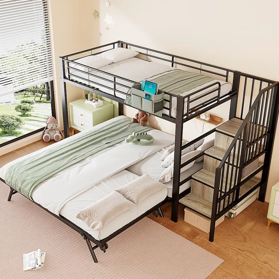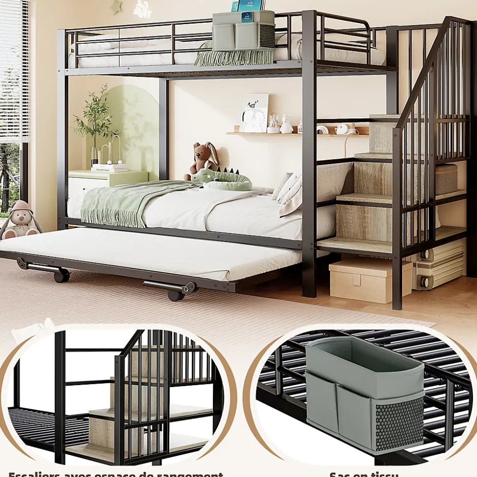 Vous avez plusieurs jeunes enfants à la maison et peu d’espace dans la chambre ? Alors ce lit superposé est fait pour vous ! Fabriqué avec une structure en fer de haute qualité, il est stable et robuste et donne à vos enfants un sentiment de sécurité. Le design astucieux des lits superposés exploite de manière optimale l’espace vertical et offre à chaque enfant son propre espace de couchage. L’ingénieux lit gigogne change véritablement la donne : retirez-le pour le transformer instantanément en un lit spacieux de 180 x 200 cm qui peut facilement accueillir des invités pour la nuit. Les marches de rangement intégrées sont incroyablement pratiques et offrent un espace de rangement caché pour les jouets et les petits objets. De plus, des sacs en tissu bien pensés facilitent l’organisation des petits objets. Achetez-en un pour vos tout-petits dès aujourd’hui !Descriptif + dimensionsMatériau du lit : métalTaille: 90×200 cmCouleur: NoirNombre de colis : 2Assemblage requis : OuiOrigine : ChineDimensions du produit : 255 x 95,5 x 164 cmDimensions intérieures du lit : 90 x 200cmHauteur totale : 164cmCapacité de poids : 120 kgÉpaisseur recommandée du matelas (sans matelas) : 10 cmDimensions intérieures du lit gigogne gigogne : 90*185Capacité de charge du lit gigogne gigogne : 120kgÉpaisseur de matelas recommandée pour lit gigogne gigogne : 10 cmRemarques※ En raison des données de mesure manuelle, il peut y avoir une erreur de 2 à 3 cm.※ Toutes les images de produits sont prises avec des produits réels, mais en raison de l’influence de la lumière du soleil et d’autres facteurs, il peut y avoir certaines différences de couleur.※ Ce produit sera divisé en 3 colis pour la livraison. Il se peut qu’ils n’arrivent pas en même temps. S’il vous plaît, attendez patiemment.※ Si vous avez des questions lors de l’installation, veuillez nous contacter dès que possible.