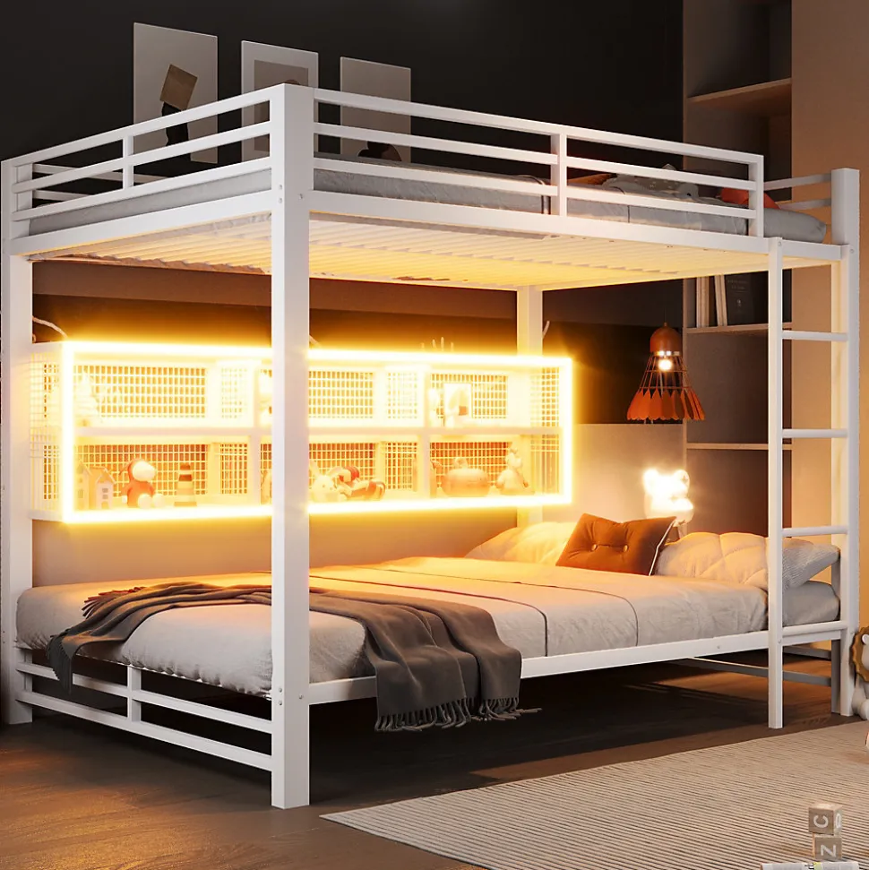 •【Grand espace de rangement】Six compartiments de rangement latéraux offrent un espace pratique pour ranger livres et jouets, facilitant ainsi le rangement de la chambre.•【Tête de lit LED】Les lumières LED intégrées aux compartiments de rangement apportent une touche de luminosité à votre chambre. Les réglages de couleur personnalisables vous permettent d’adapter facilement l’éclairage à votre humeur ou à vos activités, créant ainsi l’ambiance idéale.•【Robuste et durable】La structure de ce lit superposé est fabriquée en métal de haute qualité, garantissant une solidité et une durabilité optimales, ainsi qu’une grande stabilité.•【Sécurité garantie】Les lattes métalliques robustes s’intègrent parfaitement à la structure déjà solide du lit, renforçant encore sa stabilité. Le lit superposé est également équipé de barrières de sécurité pour une protection accrue.•【Facile à assembler】Des instructions détaillées et des pièces complètes sont disponibles pour vous aider à réaliser l’assemblage rapidement.