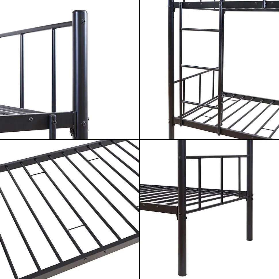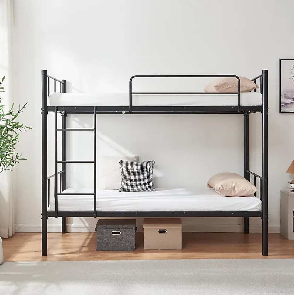Lit superposéLe lit superposé est une solution de couchage fonctionnelle pour 2 personnes. Il est polyvalent et s’intègre parfaitement à différents styles d’intérieur.Le cadre métallique robuste et ses 4 pieds assurent une stabilité fiable et une base solide pour un sommeil réparateur.Une échelle intégrée et une barrière de sécurité assurent un accès facile et un sommeil protégé à la couchette supérieure.Points forts :- lit superposé pratique et peu encombrant- échelle fixée sur le côté- barrière de sécurité sur la partie supérieure- idéal pour les chambres d’enfants/d’adolescents, les chambres d’amis ou les maisons de vacances- construction stable- montage rapide- surface résistante aux rayures, aux chocs et à l’abrasion- nettoyage sans effort- supporte jusqu’à 300 kgDimensions :- totales (l x l x h) : 210 x 95 x 171 cm- matelas (l x l) : 200 x 90 cm chacun- barrière de sécurité (hauteur) : 30 cm- hauteur du bord inférieur du lit : 35 cm- distance entre les surfaces de couchage : 92 cmMatière :acier, revêtement par poudreCouleur :noirContenu de la livraison :1 x lit superposéNote :Matelas, coussins, couverture et décorations non inclus dans la livraison.Remarque :Pour des raisons logistiques, le retrait par le client n’est pas disponible. La livraison est effectuée jusqu’au trottoir ou à la porte d’entrée, sans montage.Produit de la marque :[en.casa]