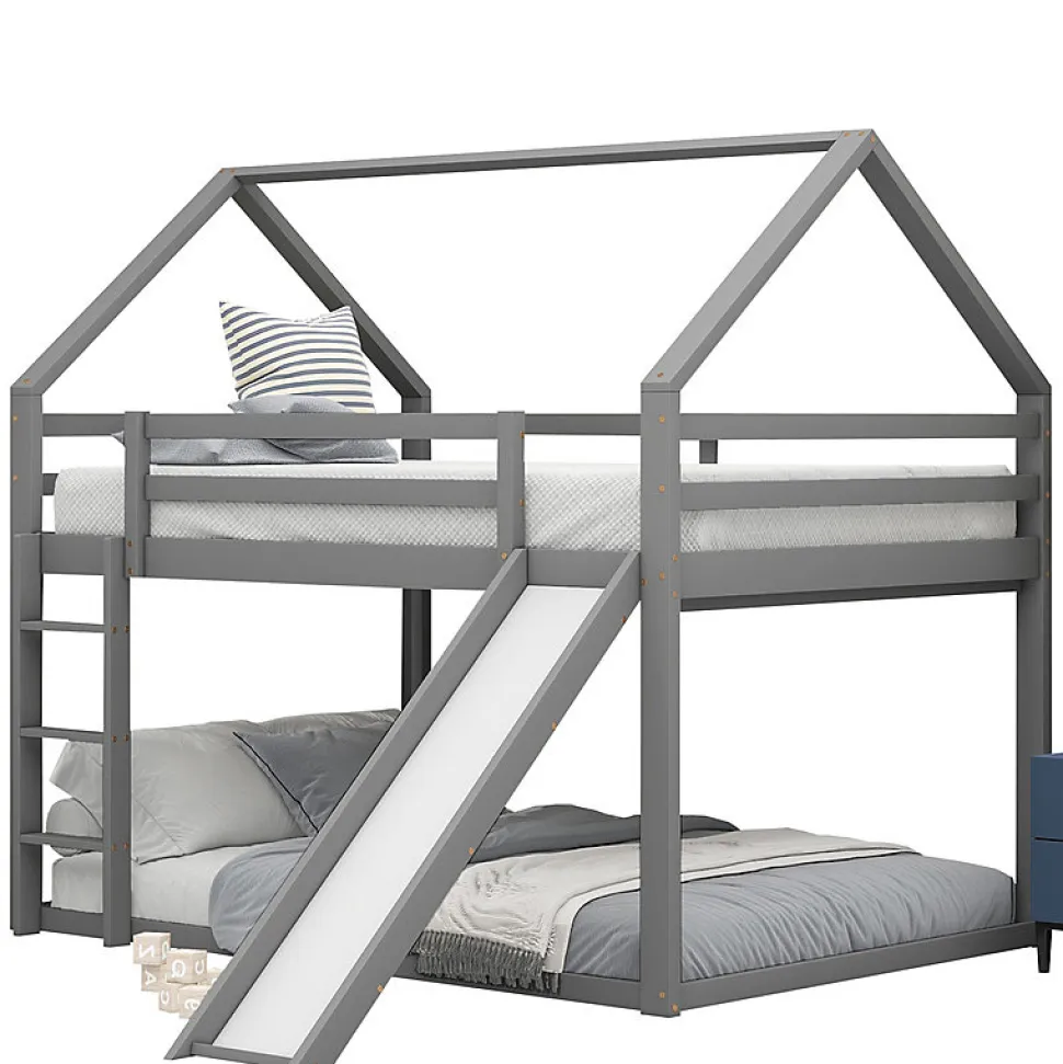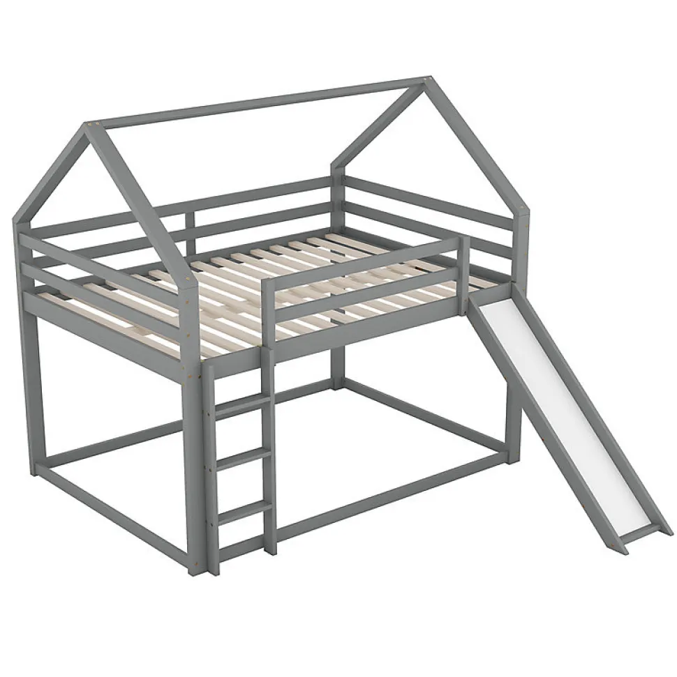 Transformez la chambre de votre enfant en un espace de rêve avec ce lit superposé 140 × 200 cm gris, en forme de maisonnette avec toboggan et échelle intégrés. Il allie jeu et confort dans un design unique. Design maison avec toboggan : structure originale et amusante qui stimule l’imagination des enfants tout en leur offrant un espace de repos sécurisé. Deux grands couchages : 140 × 200 cm en haut et en bas, parfaits pour deux enfants ou les soirées pyjama. Sécurité renforcée : barrières hautes, lit du bas au sol pour les plus petits, échelle robuste et toboggan interchangeables selon l’agencement de la pièce. Structure solide : en pin massif et MDF, vissé solidement, avec lattes robustes pour une excellente durabilité. Installation facile : livré avec notice détaillée et outils de montage inclus.Un meuble 2 en 1 qui combine fonctionnalité et plaisir pour accompagner les enfants dans leur quotidien.Caractéristiques techniques :Dimensions totales : 205 × 270 × 189 cmDimensions couchage : 140 × 200 cm (haut et bas)Hauteur : 189 cmNombre de lattes : 15Charge maximale : 120 kgPoids : 49,15 kgMatériaux : pin massif, MDF, contreplaquéCouleur : grisOrigine : ChineMontage requis, livré en 2 colis.