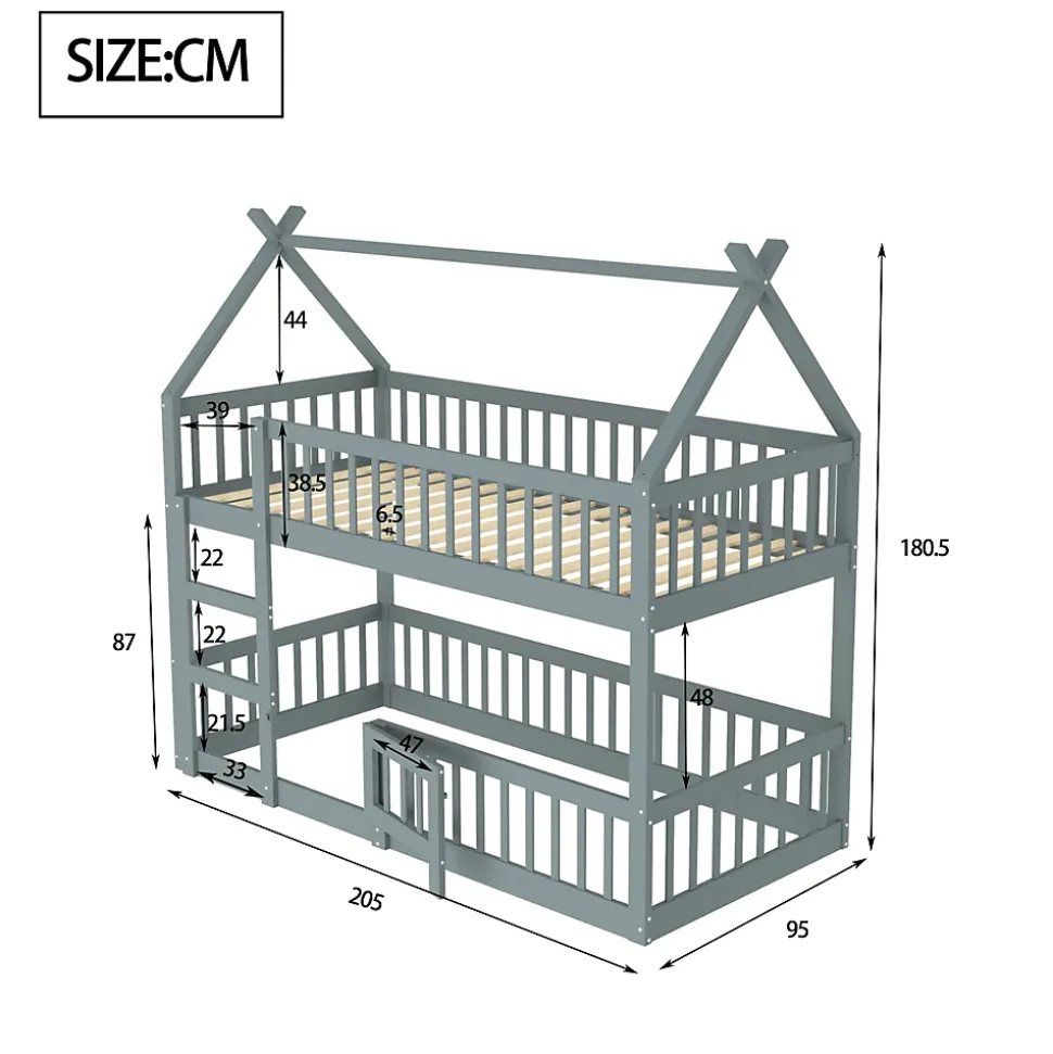 ▶ ▶ Détails ▶────────────────● Type de produit : Lit superposé enfant● Couleur : Gris● Dimensions totales du produit : 205 × 95 × 180,5 cm (L × l × H)● Dimensions détaillées du produit : Veuillez vous référer à l’image des dimensions● Nombre de colis : 2● Poids total du produit : 35,7 kg● Capacité de charge : 120 kg● Épaisseur recommandée du matelas : 12-15 cm● Taille : 90 × 200 cm (sans matelas)● Matériau du produit : Bois + Métal + Contreplaqué + MDF● Niveau de montage : Montage complet requis / Montage partiel● Poids total du colis : 40,7 kg● Nombre de lattes : 14● Temps estimé de montage : 2 heures● Nombre de personnes recommandé : 2● Outils supplémentaires requis : Tous les outils inclus / tournevis● Éviter les outils électriques : Oui► Remarques ►※ Ce produit est livré en 2 colis. Ils peuvent ne pas arriver en même temps. Veuillez patienter.※ En raison des mesures manuelles, un écart de 2-3 cm peut survenir.※ Toutes les photos des produits sont prises avec le produit réel, mais des différences de couleur peuvent apparaître en raison de l’exposition au soleil ou d’autres facteurs.※ Si vous avez des questions lors de l’installation, veuillez nous contacter dès que possible.