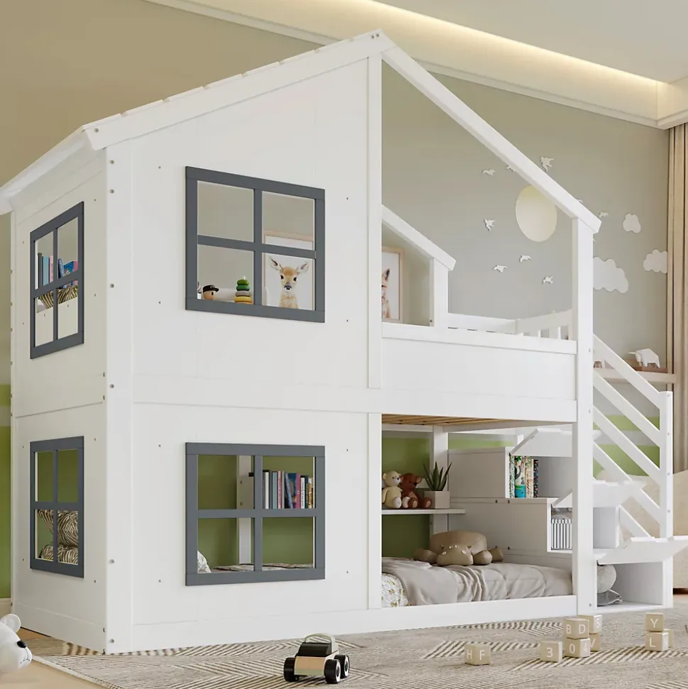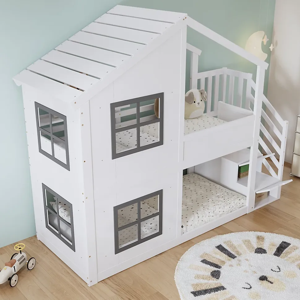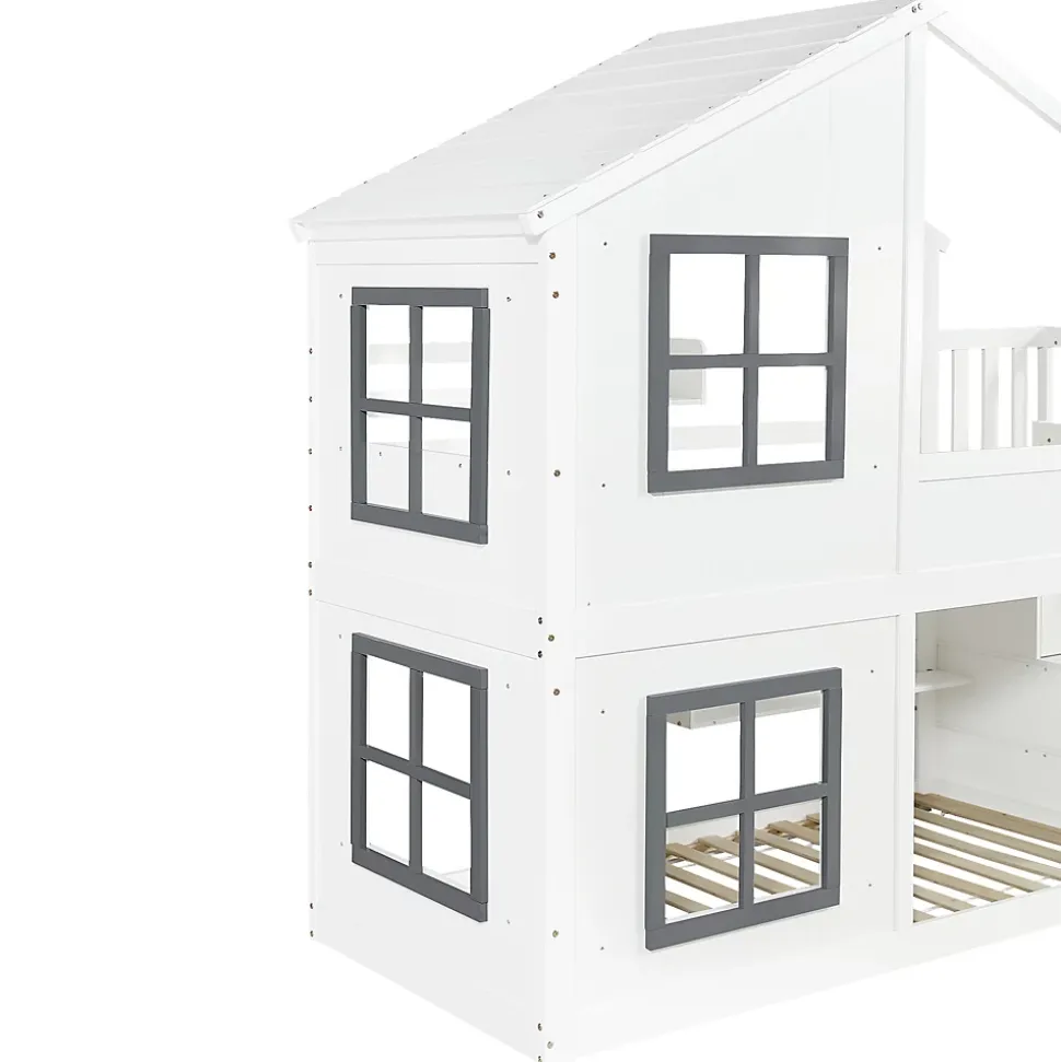 •【Grand espace de rangement】Ce lit dispose de trois compartiments de rangement, offrant un accès pratique et sécurisé aux objets tout en proposant un espace de rangement idéal pour les jouets, les livres ou les vêtements.•【Un design féérique】Le joli design de la fenêtre et du toit crée un espace de jeu et de sommeil onirique, stimulant l’imagination des enfants.•【Sûr et stable】Le sommier à lattes robuste assure une stabilité optimale et un confort de sommeil parfait, garantissant la sécurité des enfants.•【Haute qualité et durabilité】Fabriqué en pin, MDF et contreplaqué, disponible en blanc et gris, ce lit allie durabilité, robustesse et esthétique.•【Un choix polyvalent】Il s’intègre facilement à tous les styles de décoration de chambre d’enfant. Mesurant 90 x 200 cm, c’est aussi le cadeau idéal pour les petits aventuriers.•【Facile à assembler】Des instructions détaillées et des pièces complètes sont disponibles pour vous aider à réaliser l’assemblage rapidement.