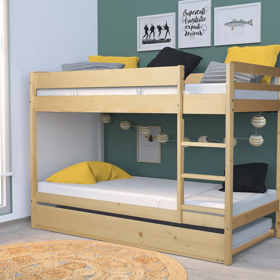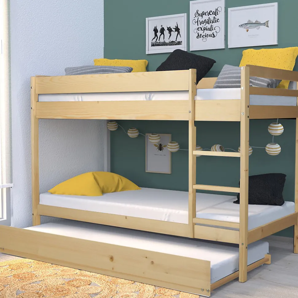 Ce lit superposé est non seulement recherché, mais également apprécié pour son efficacité dans l’optimisation de l’espace. Il est comme la solution idéale pour partager une chambre à coucher tout en maximisant l’espace disponible.Utilisez ses 2 ou 3 couchages selon vos besoins. Les 3 couchages offrent un vrai espace de repos pour 2 ou 3 personnes, sans pour autant encombrer la chambre !Matériel:- Structure en épicéa- Echelle non réversibleDimensions:Zone de couchage 90x190cmLongueur:196cmLargeur : 100 cm Hauteur : 140cmPrécautions à prendre:* Age minimum d’utilisation : 6 ans* Charge maximale d’utilisation:80 kg* Hauteur maximale de matelas conseillée : 14 cmATTENTION le matelas et la décoration ne sont pas comprise dans la livraison*Les couleurs réelles peuvent différer de ceux indiqué dans l’image en raison de la nature des paramètres de couleur de photographier et de moniteur.Support client et SAV en Français – Pas de livraison dans le DOM TOM et la Corse.**Attention la livraison est prévue au pied de l’immeuble ou de la maison et non à domicile.