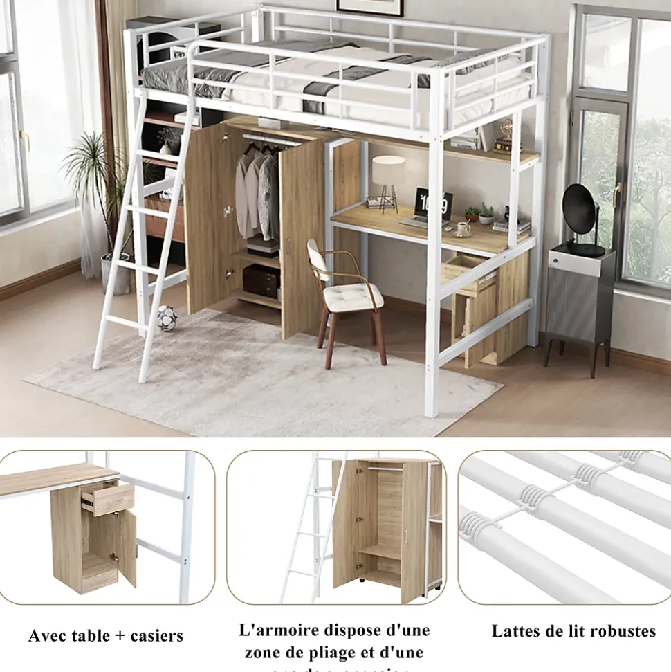 Ce lit superposé en métal est une solution complète pour les espaces restreints. Il intègre un espace de couchage, un bureau et un placard de rangement dans une seule structure robuste et élégante.Le cadre en métal blanc associé à des panneaux en MDF effet bois crée une atmosphère moderne et chaleureuse. Idéal pour les enfants comme pour les adolescents.Points forts :Zone de travail et armoire intégréesEscalier à 4 marches sécuriséStructure robuste et stableRangement spacieux sous le litDesign sobre, facile à assortirDimensions & poids :Dimensions totales : 204x149x180 cmHauteur sous le lit : 149,5 cmPoids total : 76,5 kgMatelas recommandé : 90×200 cm (épaisseur ≤10 cm)Charge maximale : lit 120 kg / bureau 40 kg / armoire 40 kgCaractéristiques :Matériaux : Métal + MDFLattes : métalCouleur : Blanc + Bois naturelÀ monter soi-mêmeNombre de colis : 3