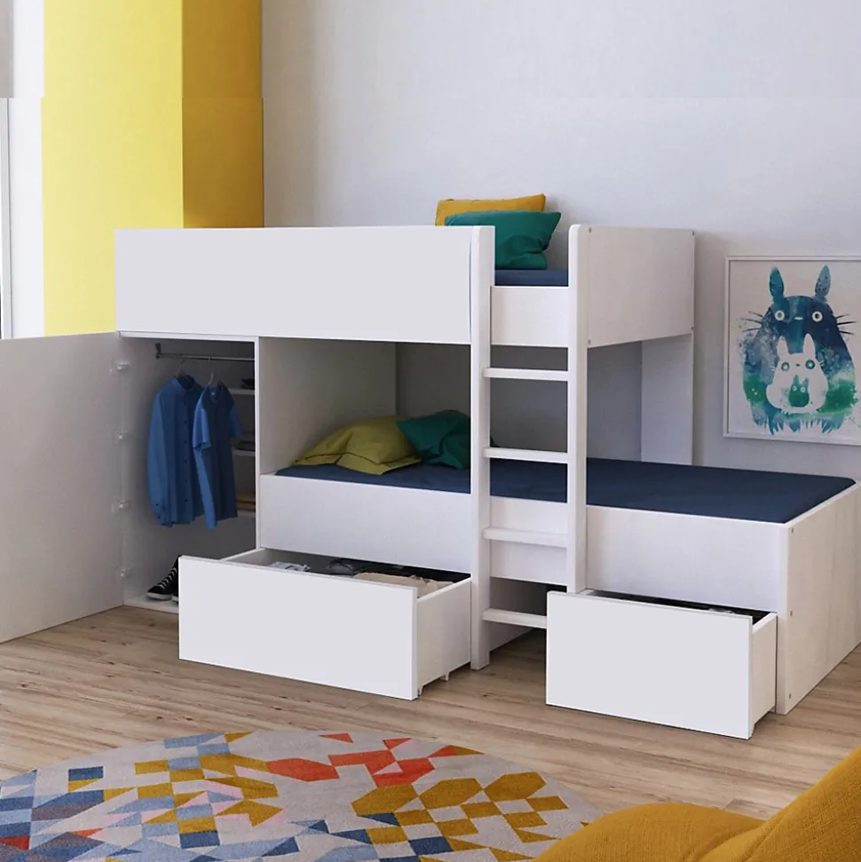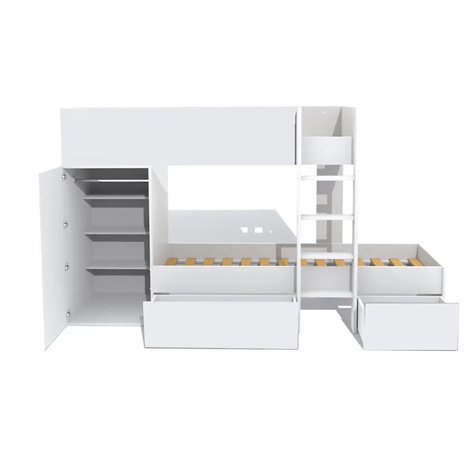 Lit superposé TWIN 90 x 190 cm avec armoire et 2 tiroirs de rangementStructure en panneau de particules.Finition : Blanc2 couchages de 90×190 cm2 sommiers à 14 lattes en épicéa2 tiroirs de rangement et armoire intégrée avec 1 penderie et 3 tablettes.Petit(s) tiroirs : 56 x 29 x 49 cm – Intérieur 52 x 18 x 46 cmGrand(s) tiroirs : 94 x 29 x 49 cm – Intérieur 90 x 18 x 46 cmEchelle non réversible.Poids net : 144 kgPrécautions à prendre :* Charge maximale d’utilisation : 80 kgs* Age minimum d’utilisation : 6 ans* Hauteur maximale de matelas conseillée pour le couchage du haut : 14 cmConseils d’entretien: Ne pas utiliser de produit solvant, diluant ni abrasif.Livré démonté avec sommiers et sans matelas ni accessoires de décoration. A monter soi-mêmeDimensions:252x111x145