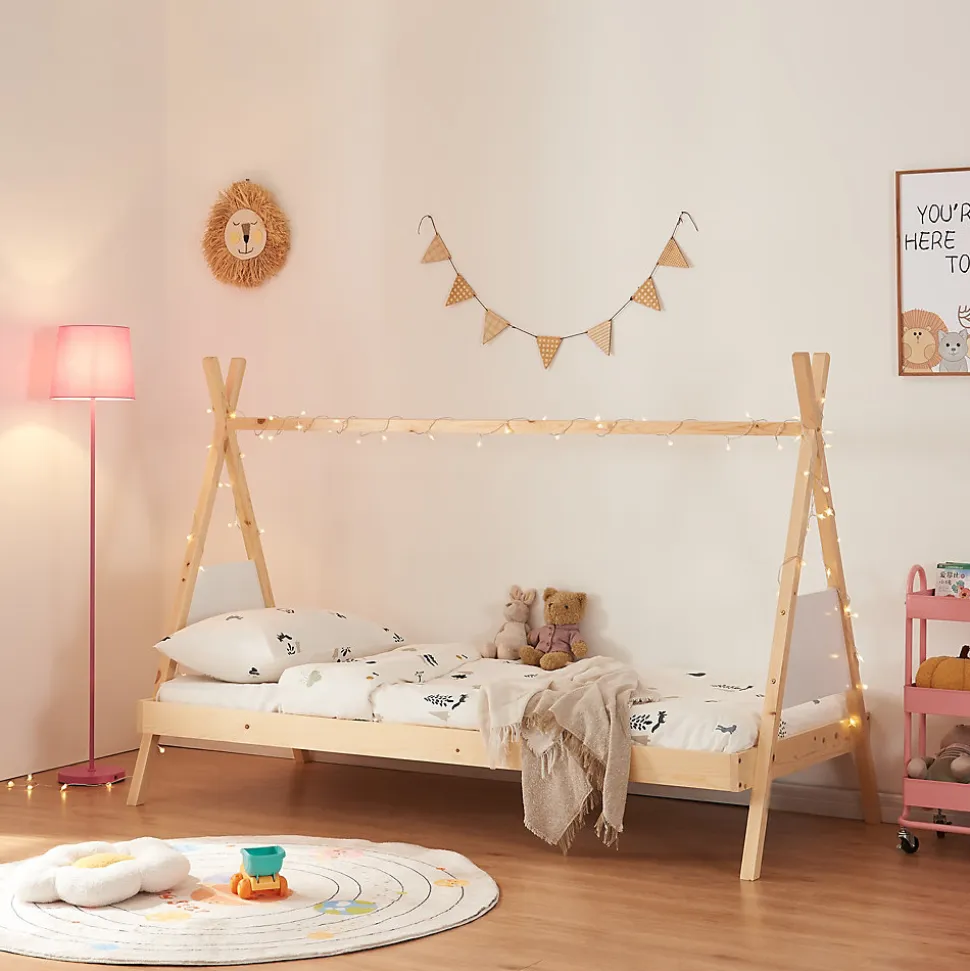 - Lit enfant en forme de tipi : Créez un espace de sommeil et de jeu unique et magique pour votre enfant avec ce lit en forme de tente. Son design innovant stimule l’imagination des petits et les invite à des aventures rêvées.