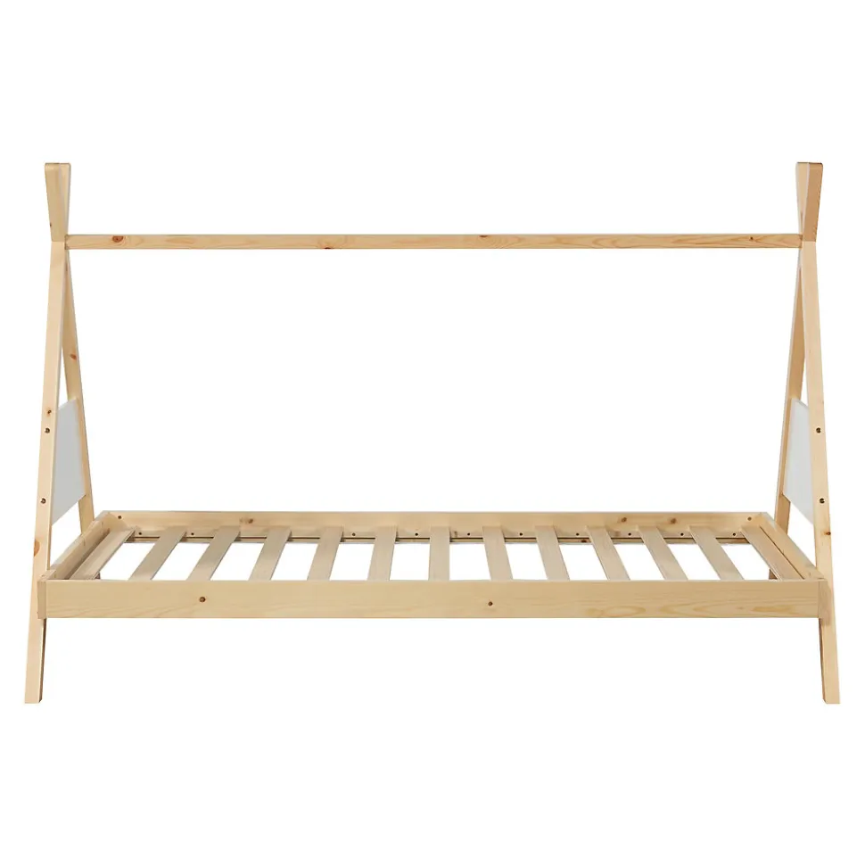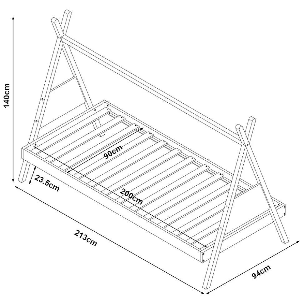 Lit tipiCe lit enfant en bois naturel transforme chaque chambre en un paradis magique pour dormir et jouer. Gâce à son design en forme de tente, il crée une atmosphère confortable pour les petits aventuriers. C’est un lieu de sommeil reposant pour votre petit et il s’intègre parfaitement dans différents styles de décoration. Sa conception permet de le personnaliser avec des guirlandes pour une ambiance chaleureuse. Transformez la chambre de votre enfant en un lieu plein de magie et de sécurité avec ce lit tipi enchanteur.Points forts :- lit enfant en forme de tipi- convient aux filles et aux garçons- entretoise supérieure pour accrocher des guirlandes- montage rapide et facile- peut supporter jusqu’à 100 kgMatière :- cadre de lit : bois de pin- sommier à lattes : contreplaquéDimensions :- totales (longueur x largeur x hauteur) : 213 x 94 x 140 cm- surface de couchage (longueur x largeur) : 200 x 90 cm- hauteur des pieds : 23,5 cmCouleur :naturel / blancContenu de la livraison :1 x lit d’enfant1 x sommier à lattes standard (modèle simple)A noter :Le matelas, l’oreiller, la couverture et tous les autres objets de décoration ne font pas partie de l’offre.Remarque :Pour des raisons logistiques, il n’est malheureusement pas possible de récupérer la marchandise en personne.La livraison s’effectue jusqu’au bord du trottoir ou jusqu’à la porte d’entrée, sans montage.Produit de la marque :[en.casa]