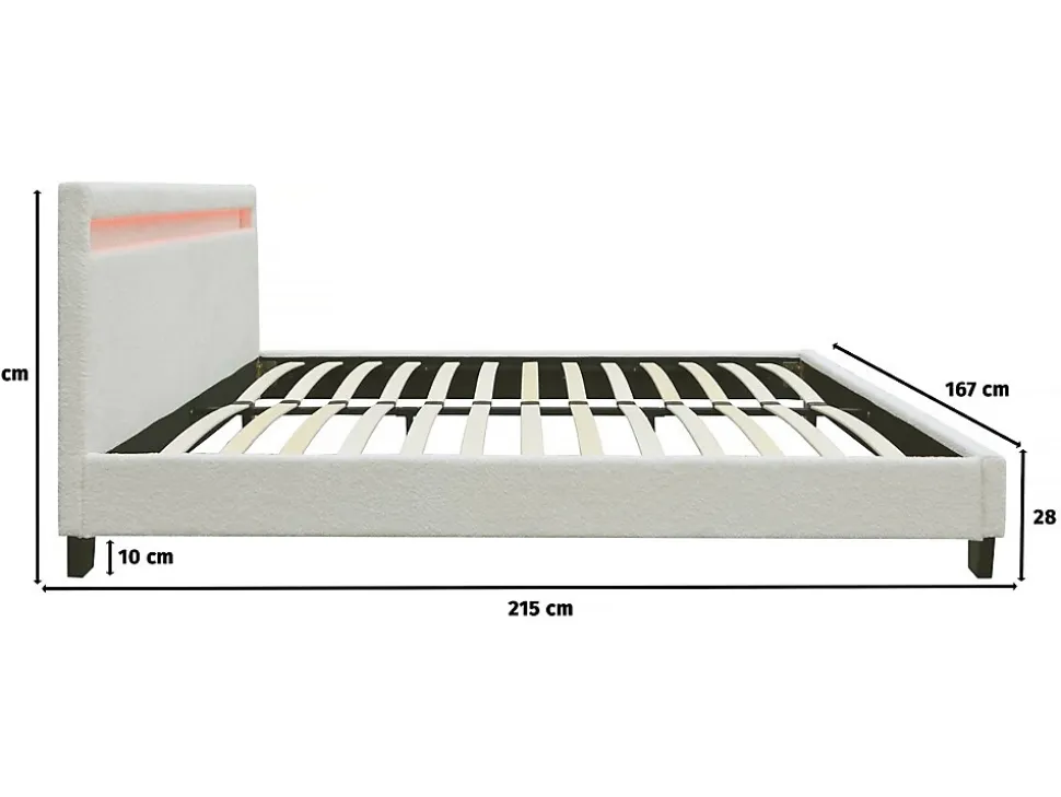 Lit en tissu bouclette « Maria » avec LED – 160 x 200 cm – CrèmeLe lit « Maria » est fabriqué avec un tissu bouclette de qualité supérieure qui offre une sensation de douceur et de confort lorsque vous vous allongez. La crème est une couleur polyvalente qui s’adapte à tous les styles de décoration, des plus modernes aux plus classiques.Mais ce n’est pas tout ! Le lit « Maria » est également équipé d’un système d’éclairage LED intégré pour vous offrir une ambiance relaxante et apaisante. Cette fonctionnalité vous permet de créer une atmosphère confortable et douillette dans votre chambre à coucher.Le lit « Maria » est un choix parfait pour ceux qui cherchent à combiner confort et style dans leur chambre à coucher. N’hésitez pas à passer commande dès maintenant et à profiter de ce lit de qualité exceptionnelle. Lit en tissu bouclette Maria – 160 x 200 cm – LED intégré – – Structure en contreplaqué – Télécommande incluse. .Descriptif: Lit en tissu bouclette Maria – 160 x 200 cm – LED intégré – – Structure en contreplaqué – Télécommande incluse.Matières: Tissu bouclettesMatière(Filtre): Tissu bouclettesLED: OuiStructure: ContreplaquéCouleurs: Crèmecouleur (filtre): BeigeDimensions: 214 x 167 cmLongueur: 214 cmLargeur: 167 cmhauteur: 28 cmDensité de la mousse: 18kg/m3Dimensions du couchage: 160 x 200 cmSommier: inclusDimensions des lattes: 80.7 x 5.2 x 1 cmLattes: 26Tête de lit: 167 x 79 x 89 cmpieds: 10 cmPoids: 35 KgConseils d’entretiens: Lors du nettoyage, afin de ne pas abîmer le tissu bouclette de ce lit, nous vous recommandons de l’aspirer à faible intensité.Colisage: 2 colis : – 1,71 x 0,97 x 0,075 m, 18 kg – 2,24 x 0,21 x 0,15 m, 17 kg