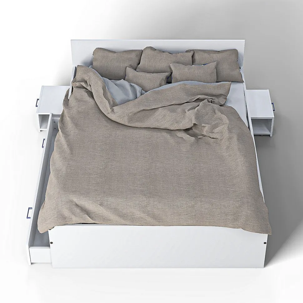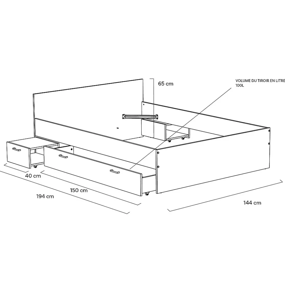 Lit TWIST 140×190 + 2 chevets + tiroir / BlancLe lit Twist apporte à la chambre un côté confortable et pratique. Composé d’ 1 grand tiroir, il permet d’optimiser facilement le rangement dans l’espace nuit. Il dispose de deux tables de chevet montées sur roulettes que l’on peut glisser sous le lit en un clin d’œil pour libérer de l’espace dans la pièce ! Grâce à son design sobre et épuré, le lit Twist est un intemporel qui conviendra à tous les intérieurs.Caractéristiques : – Structure en panneau de particules- Finition : blanc- Dimensions chevet : L40xP39xH21 cm – dimensions intérieures : L40XP33xH15 cm- Dimensions tiroir : L150xP39xH21 cm – dimensions intérieures : L146xP33xH16cmLivré démonté sans sommier et sans matelas , prévoir un sommier à cadre. A monter soi-mêmeDimensions:194x144x65 cm