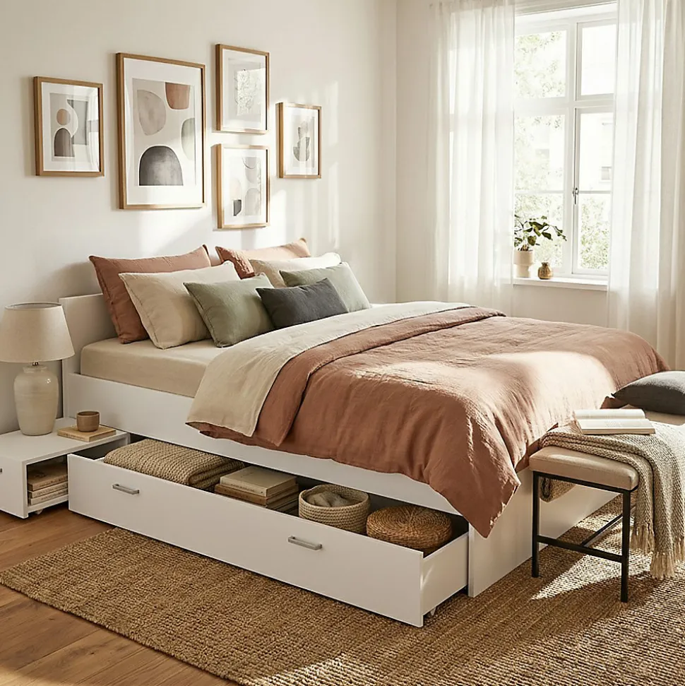 - Lit TWIST 160×200 + chevet + tiroir / BlancLe lit Twist apporte à la chambre un côté confortable et pratique. Composé de 1 grand tiroir, il permet d’optimiser facilement le rangement dans l’espace nuit. Il dispose même d’une table de chevet montée sur roulettes que l’on peut glisser sous le lit en un clin d’œil pour libérer de l’espace dans la pièce ! Grâce à son design sobre et épuré, le lit Twist est un intemporel qui conviendra à tous les styles de décoration.Caractéristiques : – Structure en panneau de particules- Finition : blanc- Dimensions chevet : L40xP39xH21 cm – dimensions intérieures : L40XP33xH15 cm- Dimensions tiroir : L160xP39xH21 cm – dimensions intérieures : L156xP33xH16cmLivré démonté sans sommier et sans matelas, prévoir un sommier à cadre. A monter soi-mêmeDimensions:204x164x65 cm