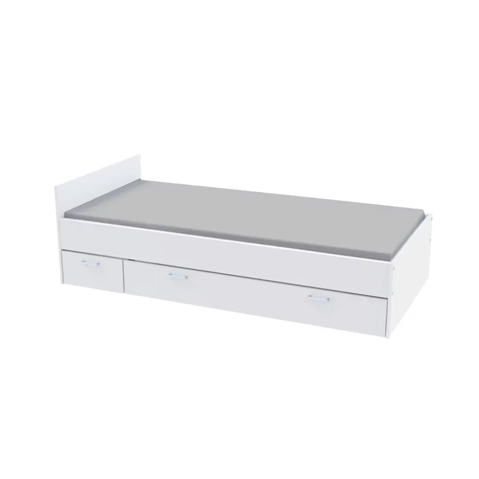 Lit TWIST 90×190 + chevets + tiroir / BlancLe lit Twist apporte à la chambre un côté confortable et pratique. Composé de 1 grand tiroir, il permet d’optimiser facilement le rangement dans l’espace nuit. Il dispose même d’une table de chevet montée sur roulettes que l’on peut glisser sous le lit en un clin d’œil pour libérer de l’espace dans la pièce ! Grâce à son design sobre et épuré, le lit Twist est un intemporel qui conviendra aux petits comme aux plus grands et à tous les styles de décoration.Caractéristiques : – Structure en panneau de particules- Finition : blanc- Dimensions chevet : L40xP39xH21 cm – dimensions intérieures : L40XP33xH15 cm- Dimensions tiroir : L150xP39xH21 cm -dimensions intérieurs : 146x33x16 cmLivré démonté sans sommier et sans matelas, prévoir un sommier à cadre. A monter soi-mêmeDimensions:194x94x65 cm