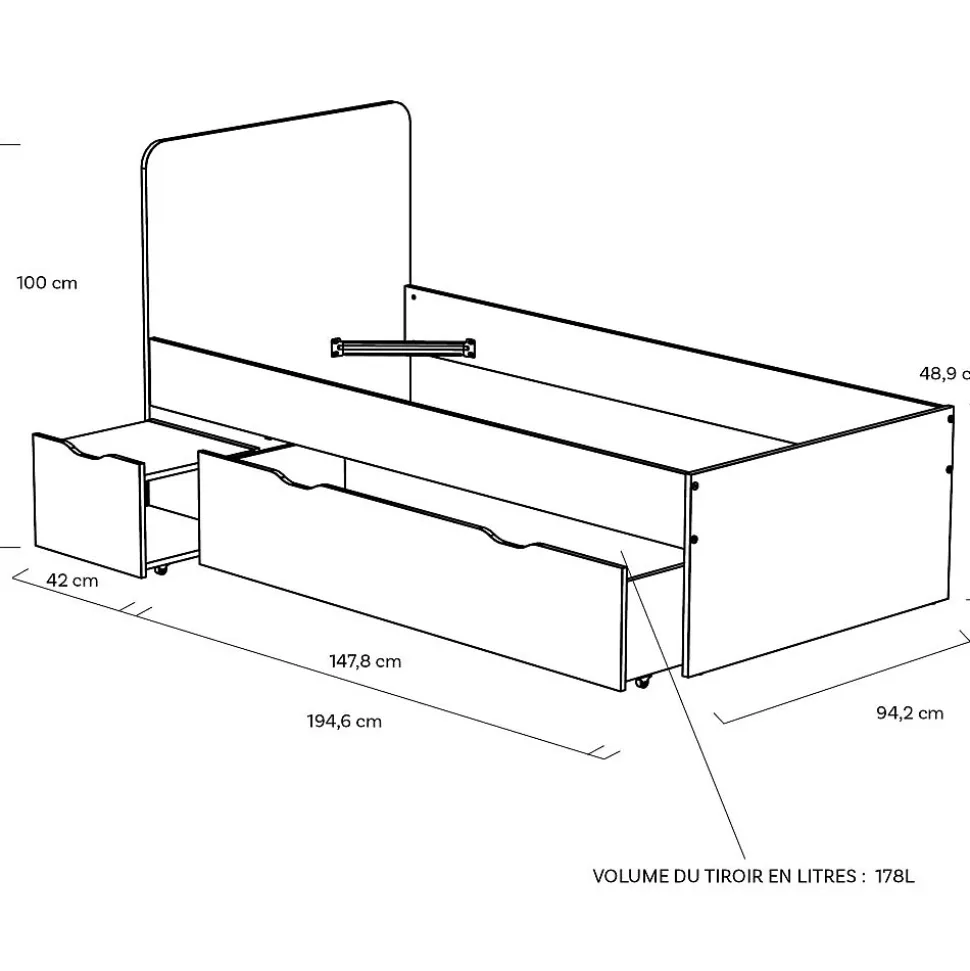 Lit simple ZENIA 90 x 190 cm avec un tiroir et un chevet intégrésGagnez de l’espace dans la chambre des vos enfants avec le lit ZENIA. Pratique avec son grand tiroir et sa table de chevet intégrée qui se glisse sous le lit. Caractéristiques : Structure en panneau de particules.Finition : blancHauteur : 45 cm – 100 cm avec tête de lit.Volume du tiroir : 178 Litres.Chevet et tiroir peuvent se placer à gauche ou à droite du lit.Livré démonté, sans sommier, sans matelas, prévoir un sommier à cadre. A monter soi-mêmeDimensions:195x96x100