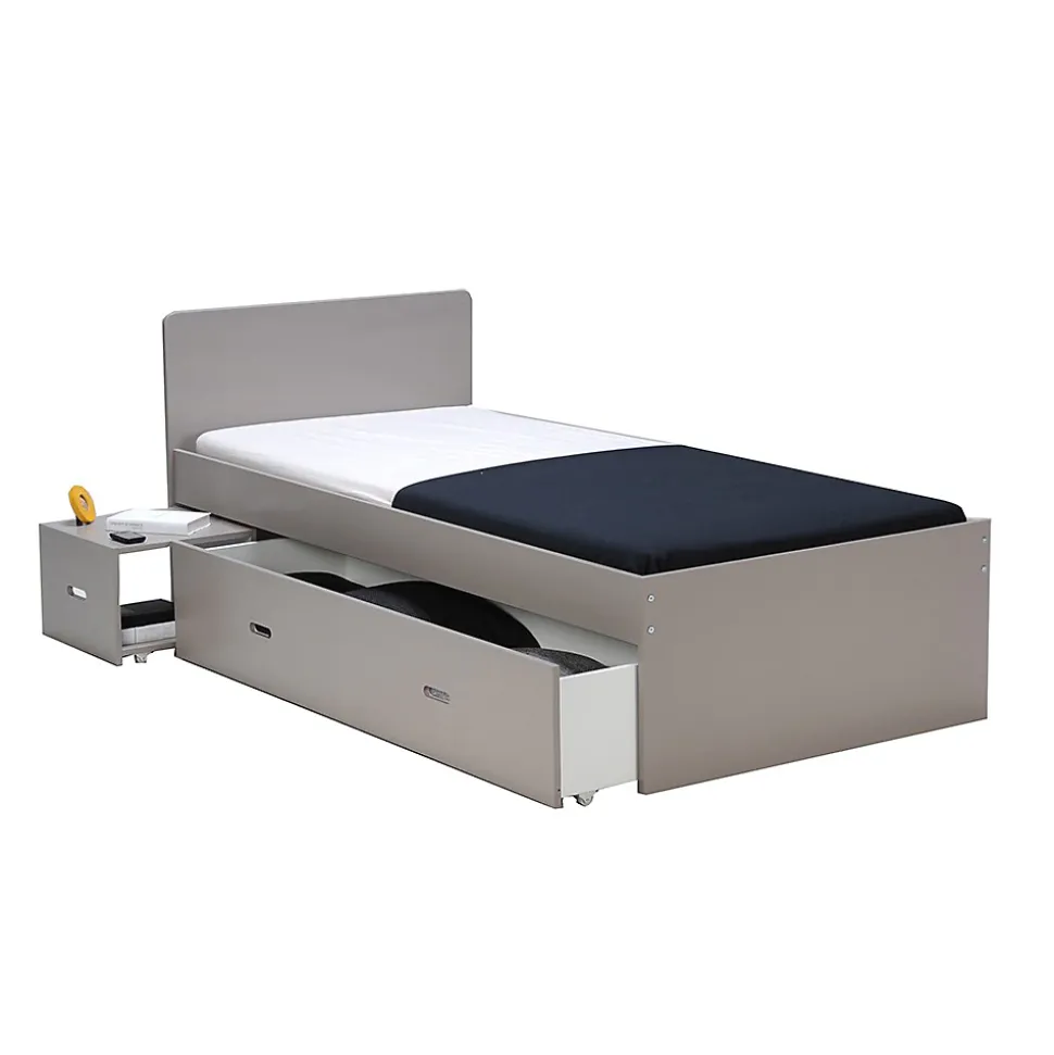 Lit simple ZENIA 90 x 190 cm avec un tiroir et un chevet intégrésGagnez de l’espace dans la chambre des vos enfants avec le lit XENIA. Pratique avec son grand tiroir et sa table de chevet intégrée qui se glisse sous le lit. Caractéristiques : Structure en MDF et panneau de particules.Finition : laqué gris.Hauteur : 45 cm – 80 cm avec tête de lit.Chevet et tiroir peuvent se placer à gauche ou à droite du lit.Livré démonté – sans sommier et sans matelas : merci de prendre un sommier à cadre. A monter soi-mêmeDimensions:195x96x80