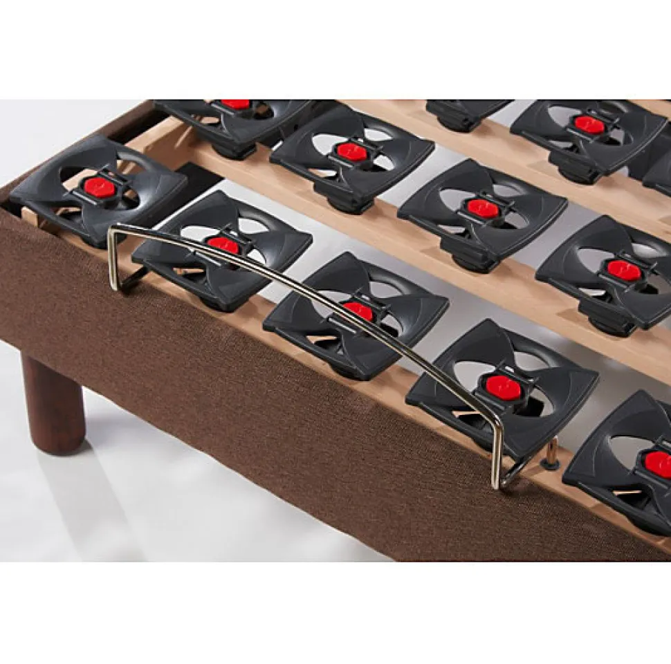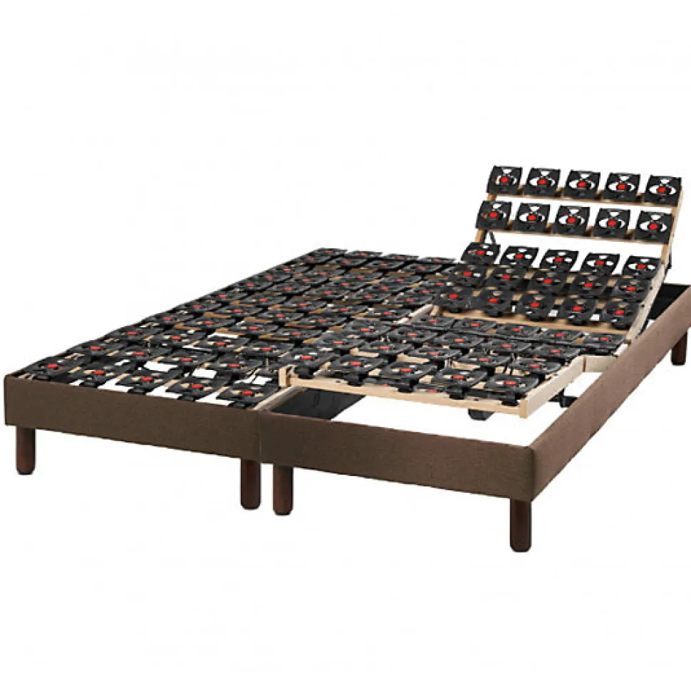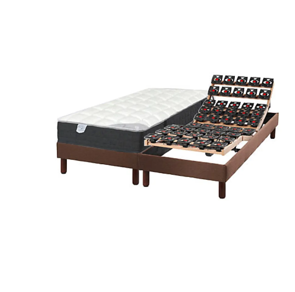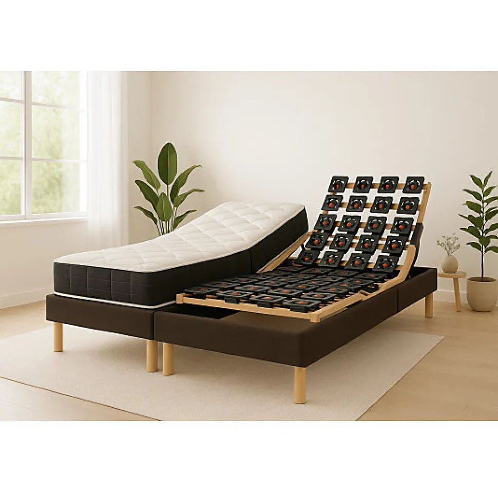 L’Ensemble :Cet ensemble contient un sommier composé de 10 rangées de plots multipositions dont 4 rangées réglables en fermeté pour la zone épaule et bassin. Il est équipé de deux moteurs Limoss 6000N fonctionnant avec télécommande filaire. Le matelas Classic Ressorts est composé de 740 ressorts ensachés recouverts d’une couche de mousse pour un accueil agréable. Le coutil est déhoussable, traité anti-acariens et anti-allergique.Le Sommier Hauteur du sommier : 14cmChassis BoisCaisse :- Cadre composé en pin massif, hauteur 14 cm- 1 traverse 50x20mm en hêtre massif avec inserts M8, 4 masses d’angle avec inserts M8- Partie amovible en multiplis, section 50×20, papier décor gris foncé métallisé kornraster- Finition caisse: papier décor WengéSuspension plots :- Suspension, 10 rangées plots TPE (Elastomère thermoplastique) dont 4 rangées (2+2) réglables dur.soft, plots montés sur traverse droite- TPE, matière à mémoire interactive qui, quelque soit la position de votre corps, renvoie une même force de soutien et reprend indéfiniement sa forme initiale (matère mémorisante apportant élasticité et longévité)Couchage :- Cinématique 5 plans à découpe morphologique assurant le soutien simultané du dos et des cuisses- Matelas préconisé : matelas ressorts spécifique literie électrique ou matelas latex, mousse épais spécifique literie electriqueMoteur:- Système 2 moteurs Limoss par sommier- Puissance 2×4