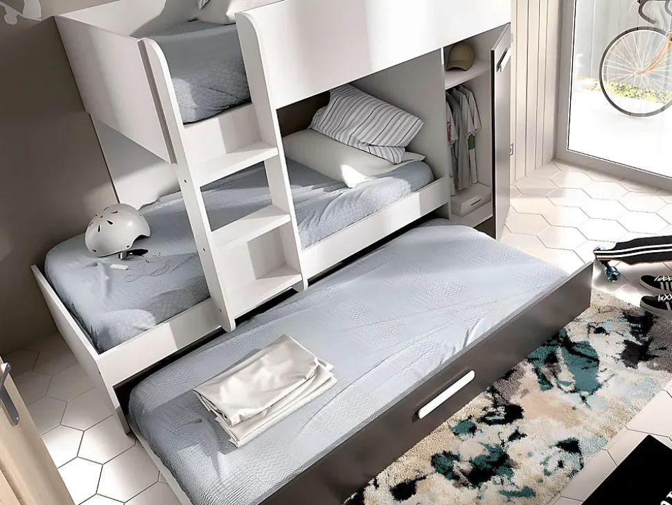 - Lits superposés ANTHONY 3 x 90 x 190 cm – Armoire et tiroir lit gigogne – Sommiers et matelas inclus – Structure : Panneaux de particules – Coloris : Blanc et anthracite – Dimensions : L243 x P97 x H150 cm – Craquez pour la praticité avec le lit ANTHONY
