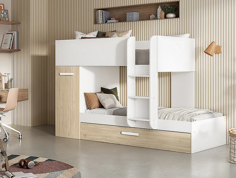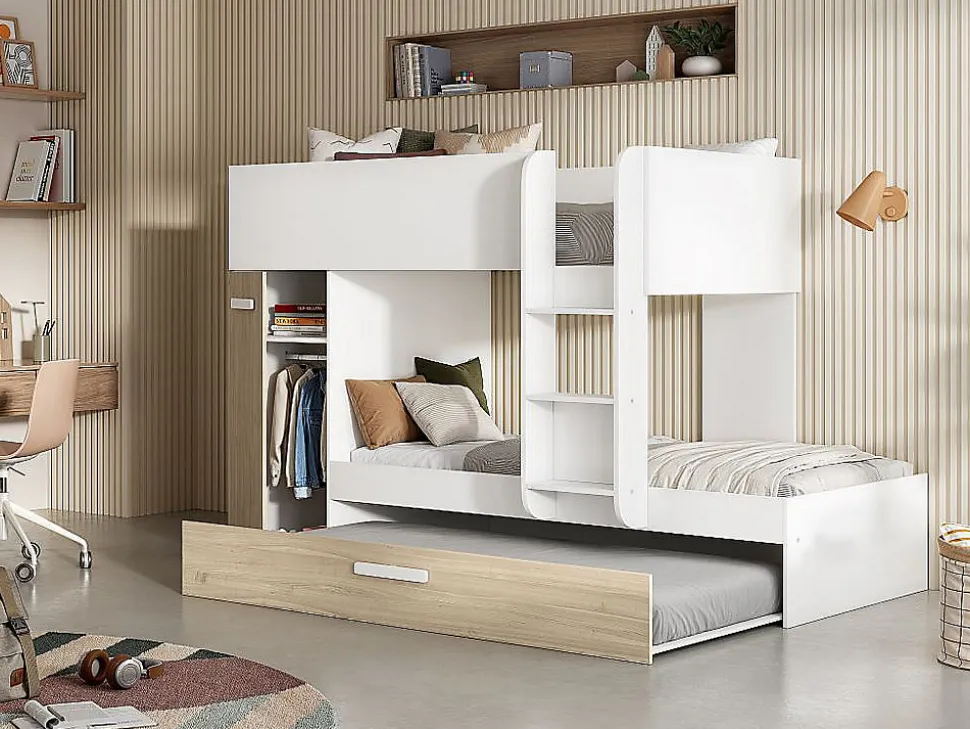 - Lits superposés ANTHONY 3 x 90 x 190 cm – Armoire et tiroir lit gigogne. Sommiers et matelas inclus. Structure : Panneaux de particules. Coloris : Blanc et chêne. Dimensions : L243 x P97 x H150 cm. Craquez pour la praticité avec le lit ANTHONY !