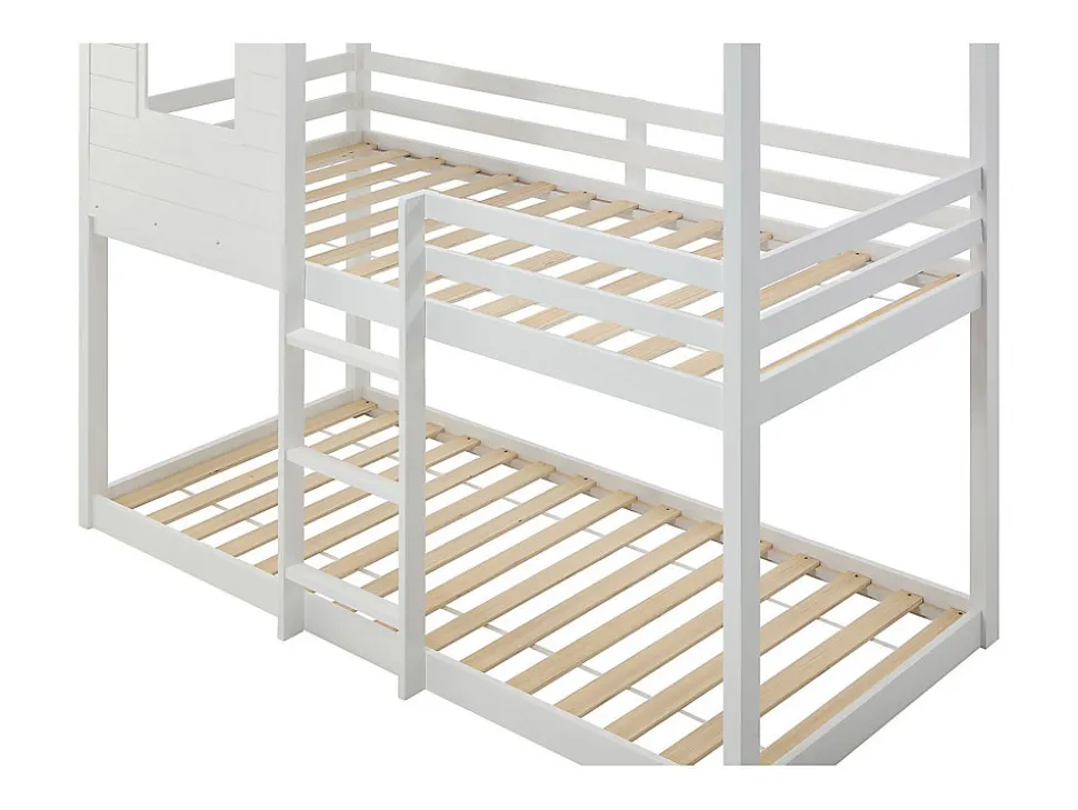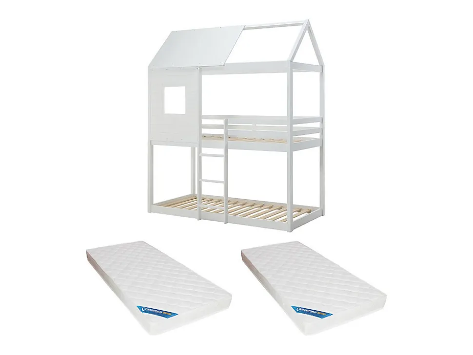 - Lits superposés cabane 2 x 90 x 190 cm – Structure : Pin et MDF – Coloris : Blanc – Dimensions : L196,5 x P97 x H231 cm + Matelas – LIDOVARA le lit qui transforme chaque nuit en aventure unique !