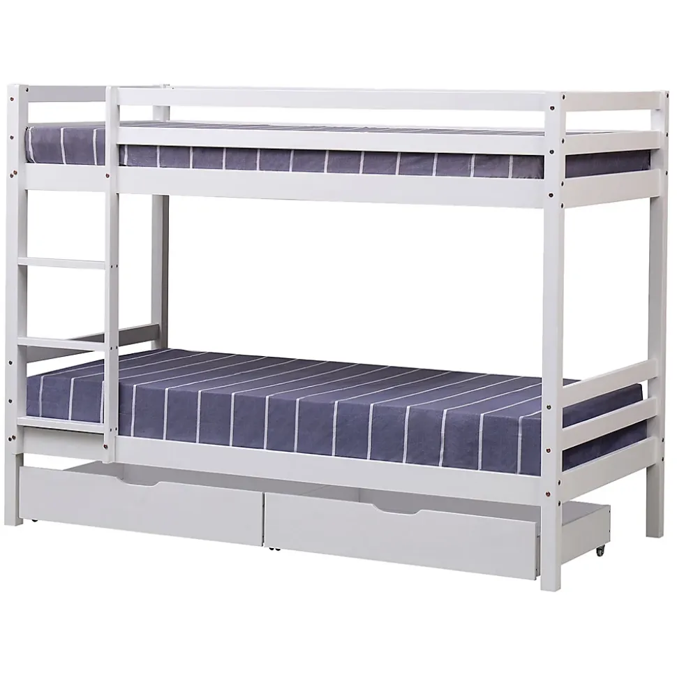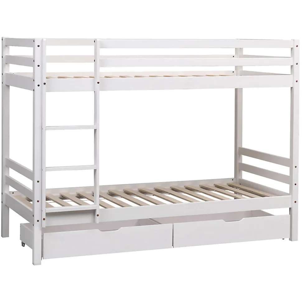 Tiroirs de rangement intégrés : Deux tiroirs pratiques pour linge, jouets ou accessoires., Sommier inclus : Lattes en contreplaqué fournies pour chaque couchage., Sécurité renforcée : Barrière haute et conformité à la norme EN 747-1.