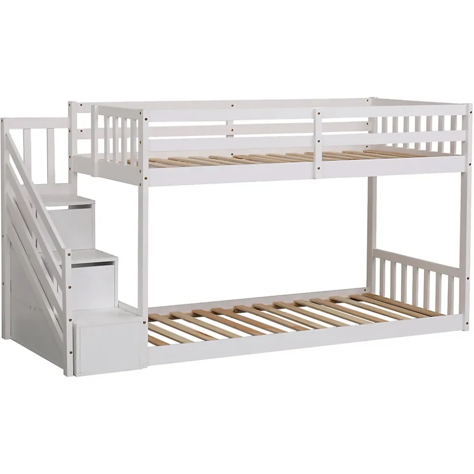 Agencement maline 2-en-1 : Grâce à ses 2 couchages superposés, ce lit optimise l’espace d’une chambre à coucher pour accueillir 2 enfants dans une même pièce., Sécurité et accès soignés : L’escalier latéral avec rambarde facilite la montée en toute confiance tandis que la barrière latérale protège efficacement le couchage., Rangement pratique intégré : 2 tiroirs logés dans les marches offrent un stockage pratique pour livres et jouets sans encombrer la chambre.