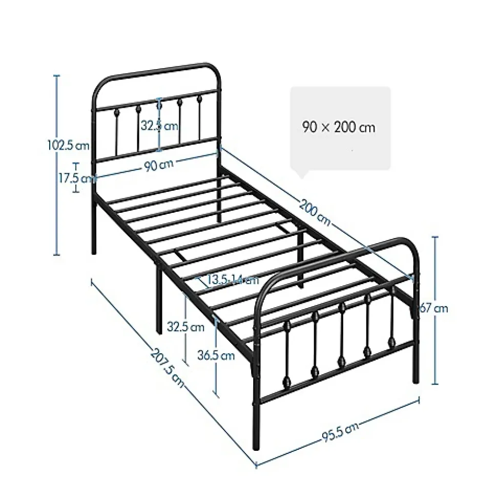 Lit simple standard – Ce lit en métal mesure 207,5 x 95,5 x 102,5 cm pour un matelas de 200 x 90 cm. Vous pouvez utiliser le matelas avec mousse à mémoire de forme, latex ou matelas à ressorts.Stable et stable : ce lit en métal est composé d’un sommier à lattes robuste, d’une tête et d’un pied de lit hauts et de 6 pieds en métal solides. Avec une capacité de charge jusqu’à 136 kg, ce cadre de lit est adapté pour un usage quotidien.Tête haute et pied de lit – Il y a suffisamment d’espace entre la tête et le pied et la surface de couchage. La tête et le pied de lit hauts permettent aux différentes épaisseurs de matelas, ce qui vous permet de choisir le confort optimal.Profondeur d’insertion raisonnable – Entre le sommier à lattes et les parties latérales du lit, il y a suffisamment d’espace pour votre matelas. La profondeur d’insertion appropriée garantit que le matelas ne glisse pas.Construction robuste : ce lit en métal est composé d’un cadre en métal massif, de pieds en métal solides et d’un sommier à lattes robuste. Le sommier à lattes offre une surface de couchage stable pour le matelas de différentes épaisseurs.