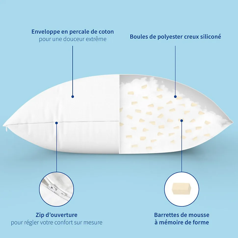 - Lot de 2 oreillers au Confort sur mesure grace a l’ouverture zippée