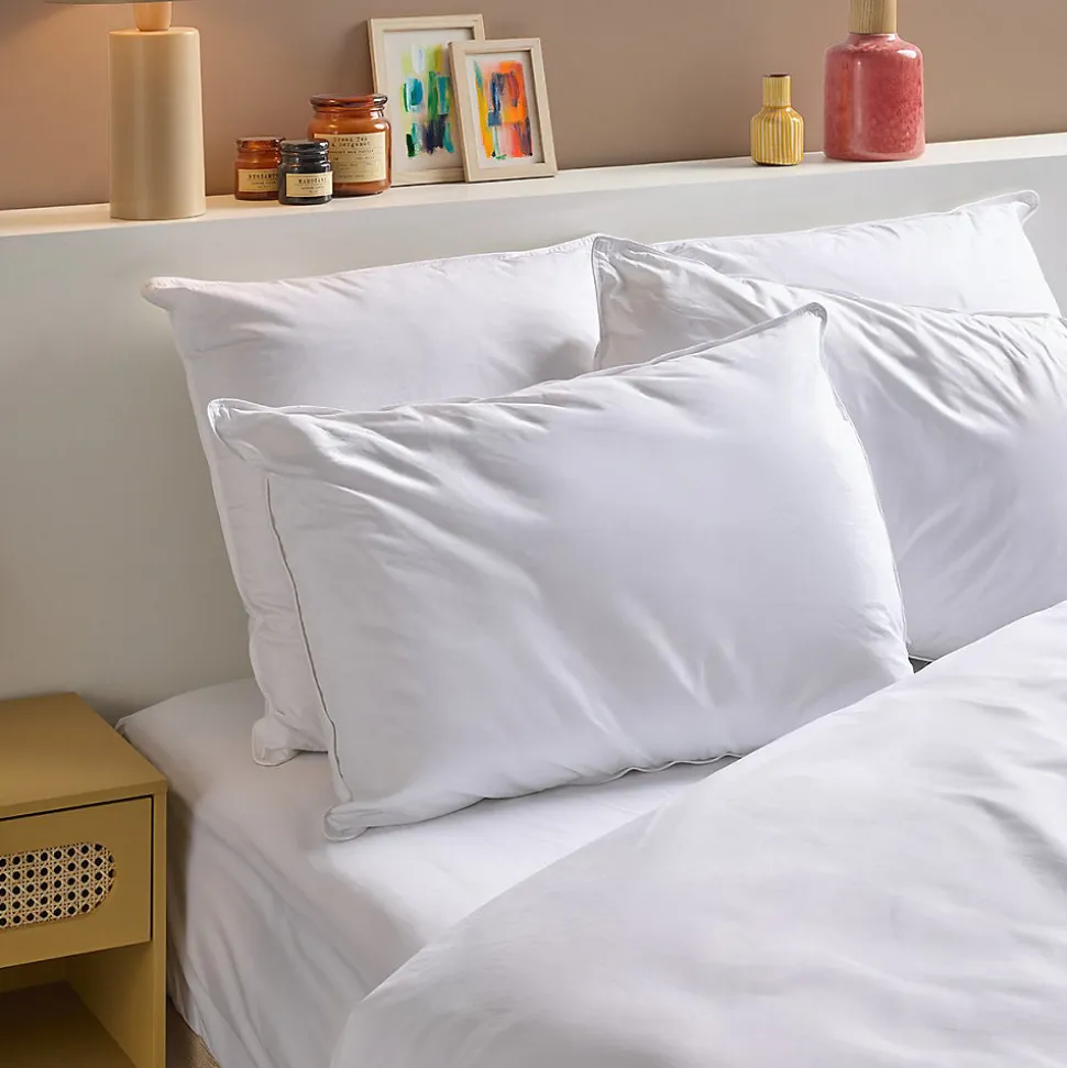 Le lot d’oreillers MOELLEUX VOLUME- Confort réglable : ferme, médium ou moelleux- Enveloppe 100% Percale Coton – Fabrication française- Lavable en machine (40°)Et si vous teniez enfin l’oreiller parfait ?Douceur exceptionnelle et confort ajustable au grès de vos besoins du moment : cet oreiller été conçu pour que le rêve commence à l’instant même où vous vous couchez ! Son enveloppe, composée à 100% de percale de coton, est équipée d’une fermeture zippée. Vous avez ainsi facilement accès au garnissage, que vous pouvez moduler pour obtenir le soutien parfait. Ce garnissage bénéficie de la technologie Microsphère : une remarquable microfibre en polyester siliconé, qui est façonnée en très petites boules. Aucun risque d’agglomération : il conserve son gonflant et sa souplesse, et il reprend aisément sa forme initiale.L’équilibre parfait entre qualité et praticitéFabriqué en France, cet oreiller bénéficie de composants sélectionnés avec soin et il affiche une jolie finition passepoil à double-couture. Pour une hygiène irréprochable, il se lave en machine à 40° (avec ou sans son garnissage) et il sèche rapidement à l’air libre. Il vous est livré avec un garnissage généreux (530g de matière pour les tailles 50x70cm et 60x60cm et 730g pour la taille 65x65cm) : vous bénéficiez ainsi d’une belle marge pour vous composer un soutien 100% sur mesure, modifiable à volonté.Ce produit est certifié de la norme OEKO-TEX Standard 100 – Testé pour les substances nocives.Produit comportant au moins 70% de matières recycléesProduit totalement recyclable