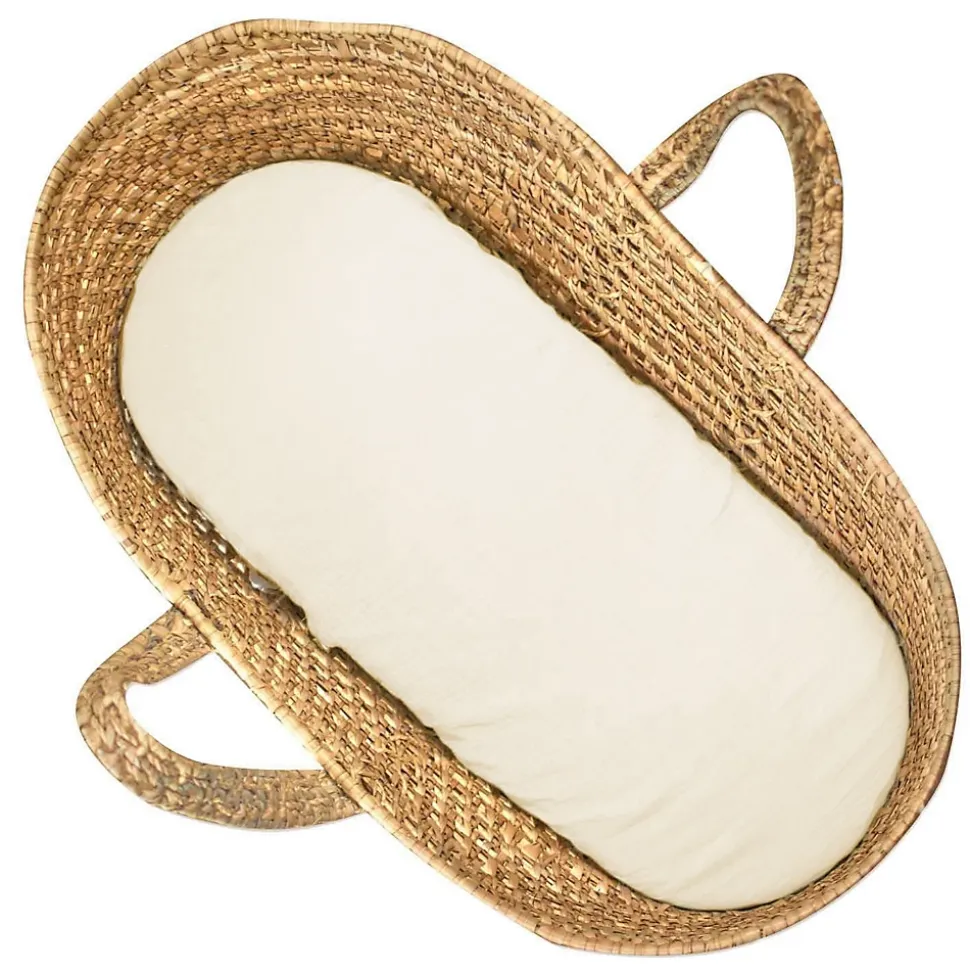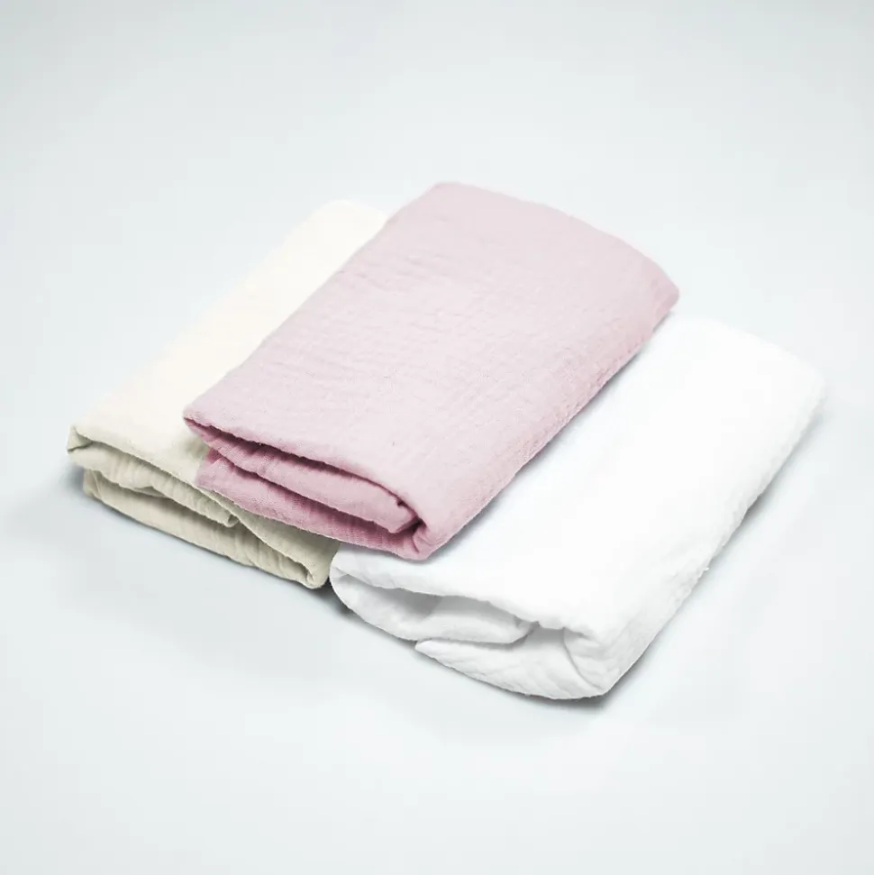 Découvrez notre lot de 3 draps housses pour couffin en double gaze de coton rose, écru et blanc. Tailles 30×70 cm, couleurs variées, fabriqués en France, certifiés OEKO-TEX et REACH.