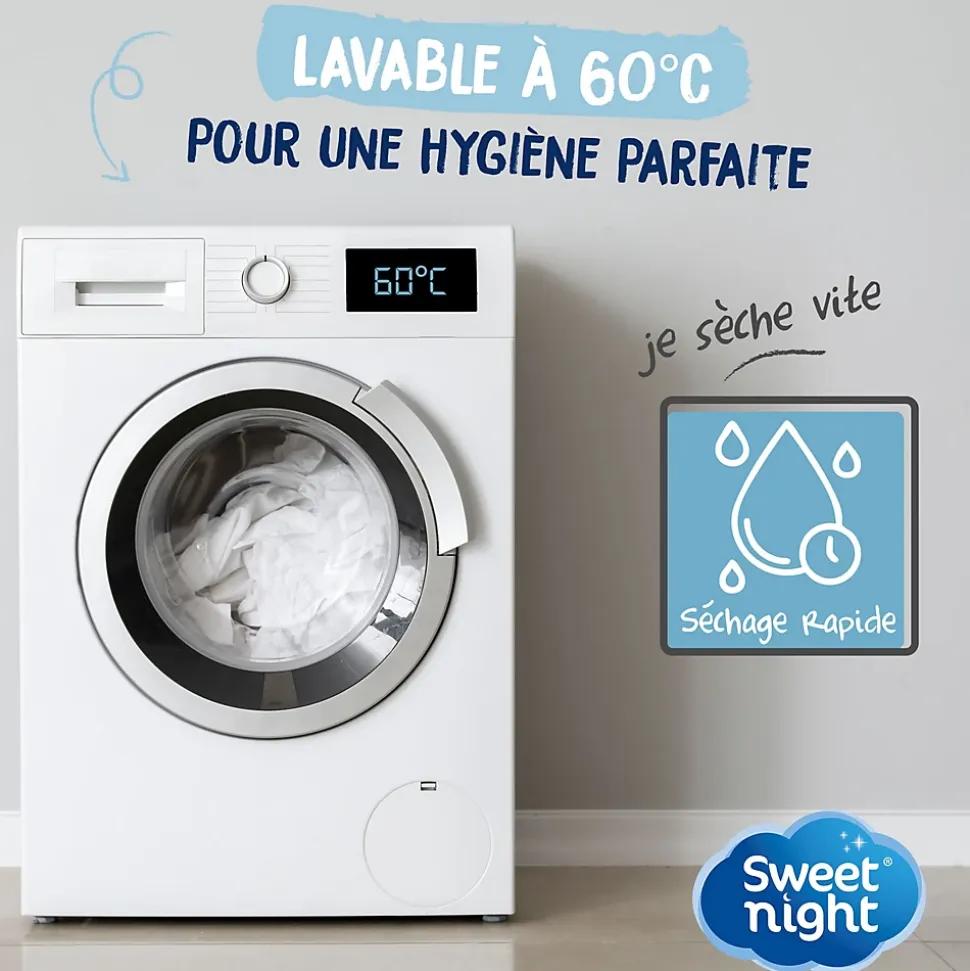 Prenez soin de votre literie en toute simplicité avec cet ensemble complet Sweetnight. Ce pack a été pensé pour ceux qui recherchent une solution rapide et efficace : il vous permet d’équiper votre matelas et vos oreillers en une seule fois, tout en gardant une surface de couchage saine et propre. Le confort repose sur une matière en bouclette de coton, choisie pour sa douceur naturelle et sa capacité à absorber l’humidité. Grâce à ce textile respirant, vous profitez de nuits paisibles sans bruits de frottements gênants. L’installation est un jeu d’enfant : le protège-matelas s’enfile comme un drap housse classique et ses bords extensibles assurent un maintien stable, peu importe vos mouvements pendant la nuit. Côté entretien, ce lot facilite votre quotidien. Tout l’ensemble supporte le lavage à 60°C pour une propreté impeccable et bénéficie d’un séchage rapide, ce qui vous permet de réinstaller votre lit très peu de temps après le lavage. C’est l’équipement idéal pour prolonger la durée de vie de votre literie tout en profitant d’un confort quotidien. Contenu du lot : Selon la dimension choisie, vous recevrez un protège-matelas accompagné d’une taie d’oreiller (pour le lit simple 90×190) ou de deux taies d’oreiller (pour les lits doubles 140×190 et 160×200). Les taies sont au format standard 65×65 cm.