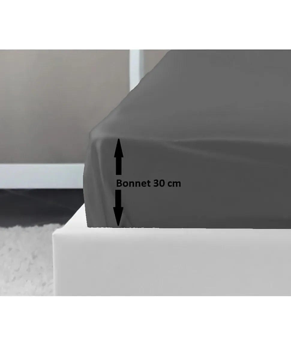 Drap housse 100% coton tissé serré 54 fils de coloris gris foncé. Avec bonnet de 30 cm. Pour lit 2 personnes. Lavable en machine a 40°C. Certifié oeKO-TEX. Dimensions : 180×200 cm.