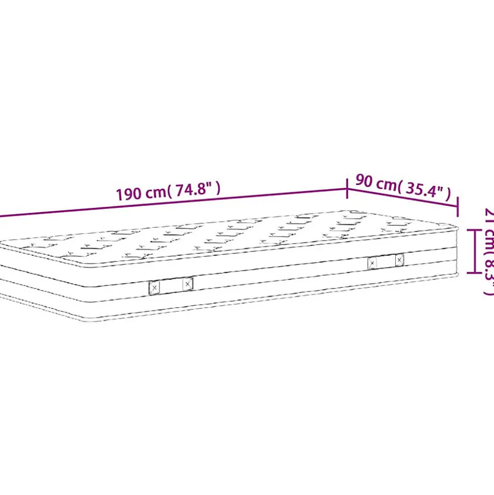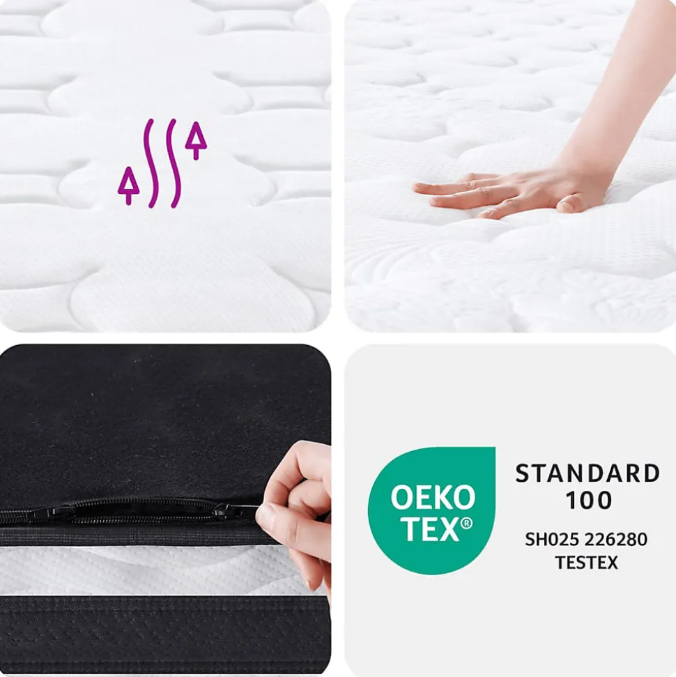 Ce matelas à ressorts bonnell est conçu pour vous apporter une sensation agréable et une expérience de sommeil confortable à la maison. Durabilité et longévité : le tissu présente un aspect simple et épuré tout en restant respirant, doux pour la peau et durable. Excellent soutien : le système de ressorts bonnell se compose de ressorts d’acier en forme de sablier interconnectés, fermes et stables, qui constituent une base de soutien durable pour le matelas. Confort accru : le matelas à ressorts est conçu avec plusieurs couches, dont une couche de mousse, une couche de matelas isolant et une couche de ressorts. Cette combinaison offre une sensation de douceur et de confort pour toutes les positions de sommeil. En outre, le matelas absorbe efficacement les bruits et les vibrations provoqués par les mouvements de rotation, garantissant ainsi un sommeil paisible et non perturbé. Entretien facile : le matelas en mousse à ressorts est doté d’une longue fermeture éclair, ce qui permet de retirer facilement la housse pour la nettoyer. Bon à savoir :La housse du matelas est lavable jusqu’à 40 °C. Veillez à ne pas la laver fréquemment. Pour votre confort, le matelas est compressé et roulé dans une boîte, et vous pouvez facilement le déplacer et l’installer dans votre pièce.Couleur : blanc, gris foncé et noirMatériau : tissu (100 % polyester)Matériau de remplissage : ressorts bonnell, mousse, coussin d’isolationDimensions : 90 x 190 x 21 cm (l x L x é)Dureté : moyenModèles de quilting