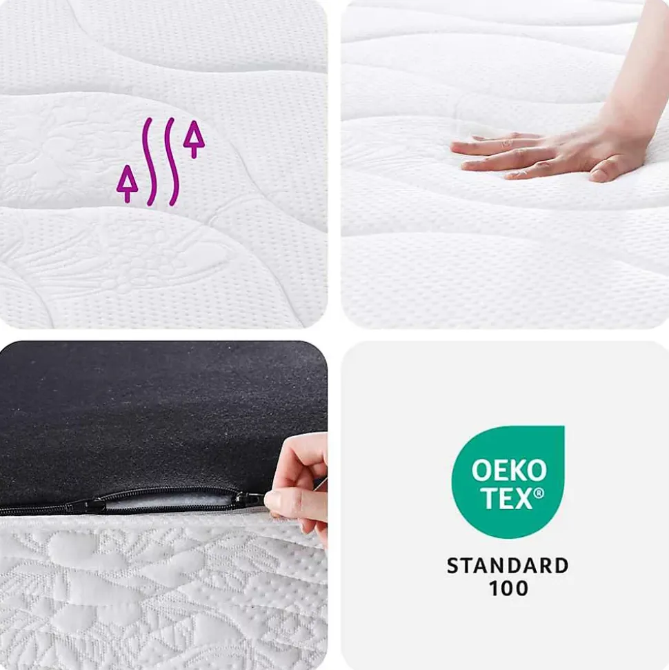 Ce matelas à ressorts Bonnell pour enfants est conçu pour vous apporter une sensation agréable et une expérience de sommeil confortable à la maison. Durabilité et longévité : le tissu présente un aspect simple et épuré tout en restant respirant, doux pour la peau et durable. Excellent soutien : le système de ressorts bonnell se compose de ressorts d’acier en forme de sablier interconnectés, fermes et stables, qui constituent une base de soutien durable pour le matelas.Confort accru : le matelas à ressorts est conçu avec plusieurs couches, dont une couche de mousse, une couche de matelas isolant et une couche de ressorts. Cette combinaison offre une sensation de douceur et de confort pour toutes les positions de sommeil. En outre, le matelas absorbe efficacement les bruits et les vibrations provoqués par les mouvements de rotation, garantissant ainsi un sommeil paisible et non perturbé. Bon à savoir :Pour votre confort, le matelas est compressé et roulé dans une boîte, et vous pouvez facilement le déplacer et l’installer dans votre pièce.Pour des raisons d’hygiène, vous ne pouvez pas retourner le matelas si l’emballage a été ouvert ou retiré.Couleur : blanc et noirMatériau : tissu (100 % polyester)Matériau de remplissage : ressorts bonnell, mousse, coussin d’isolationDimensions : 80 x 160 x 18 cm (l x L x é)Dureté : moyenneModèles de jacquard et de quilting