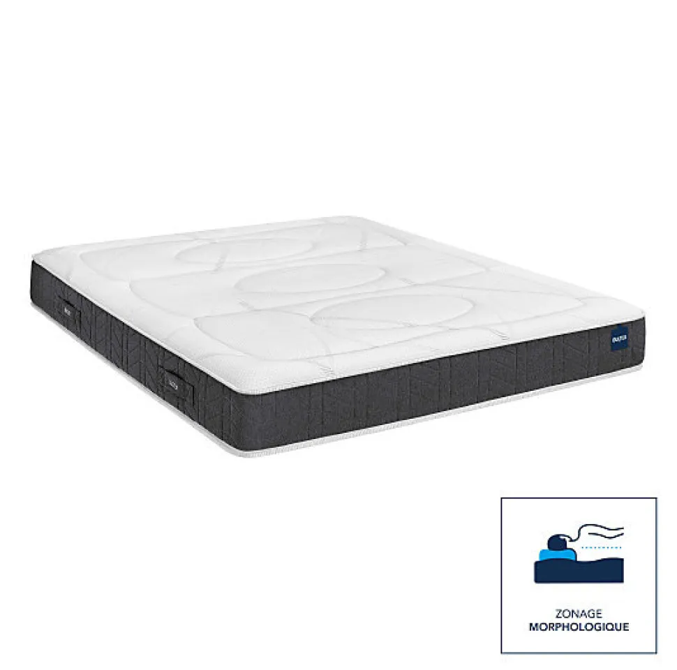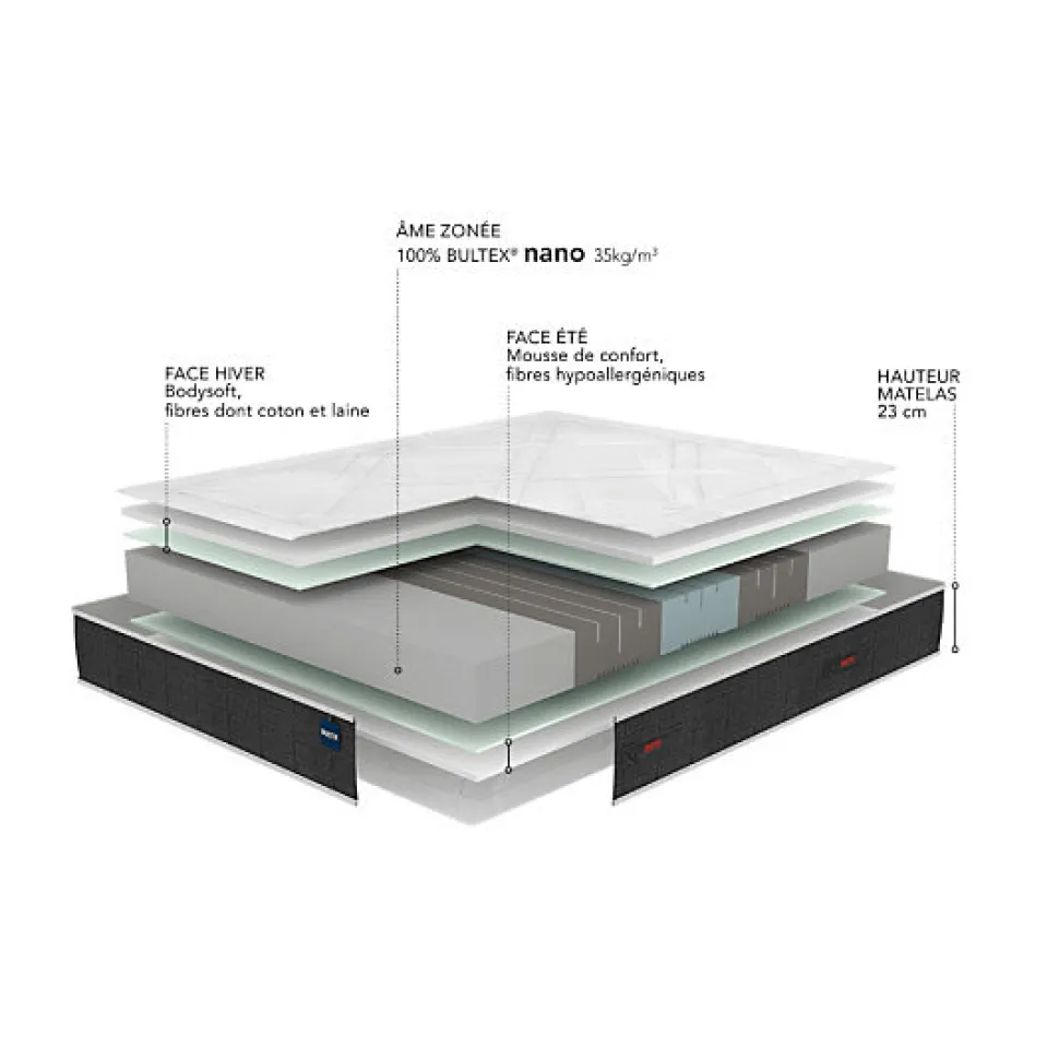 MATELAS SMART REPAIR – BULTEX, GAMME POWERLe matelas Smart Repair de Bultex combine confort moelleux et soutien ferme grâce à la mousse Nano et 5 zones de confort. Conçu pour offrir un soutien ferme avec un accueil moelleux, il est particulièrement recommandé pour les dormeurs ayant mal au dos, assurant un alignement optimal de la colonne vertébrale. LES POINTS FORTS POUR UN SOMMEIL D’EXCEPTION :Haute durabilité : La mousse Bultex Nano conserve son confort dans le temps pour un matelas durable et agréable année après année.Aération optimale : La structure alvéolaire de la mousse assure une circulation efficace de l’air, maintenant le matelas frais et hygiénique.Innocuité totale : Certification OEKO-TEX et tests anti-acariens garantissent un environnement de sommeil sain et sécurisé.Poids léger : Facile à manipuler, le matelas Bultex Nano allie légèreté et confort durable.Soutien ciblé : 5 zones de confort pour un alignement optimal de la colonne vertébrale et un soutien morphologique précis. DÉTAILS TECHNIQUES & TECHNOLOGIES :Hauteur : 23 cm – Épaisseur optimisée pour un soutien ferme et un accueil moelleux.Accueil : Moelleux – Sensation moelleuse dès le premier contact.Soutien : Ferme – Maintien précis et ergonomique adapté aux besoins de chaque dormeur.1. Le Cœur du matelas : Âme Bultex NanoÂme 100 % Bultex Nano, densité 35 kg/m³.Assure un soutien ferme et durable.2. Le Garnissage & Faces de couchage</str