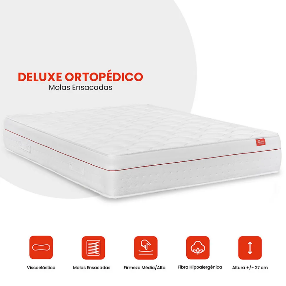 Matelas Deluxe Orthopédique 190 x 140 cm, 27 cm. Ressorts ensachés et viscoélastique, réversible, soutien medium, tissu respirant.