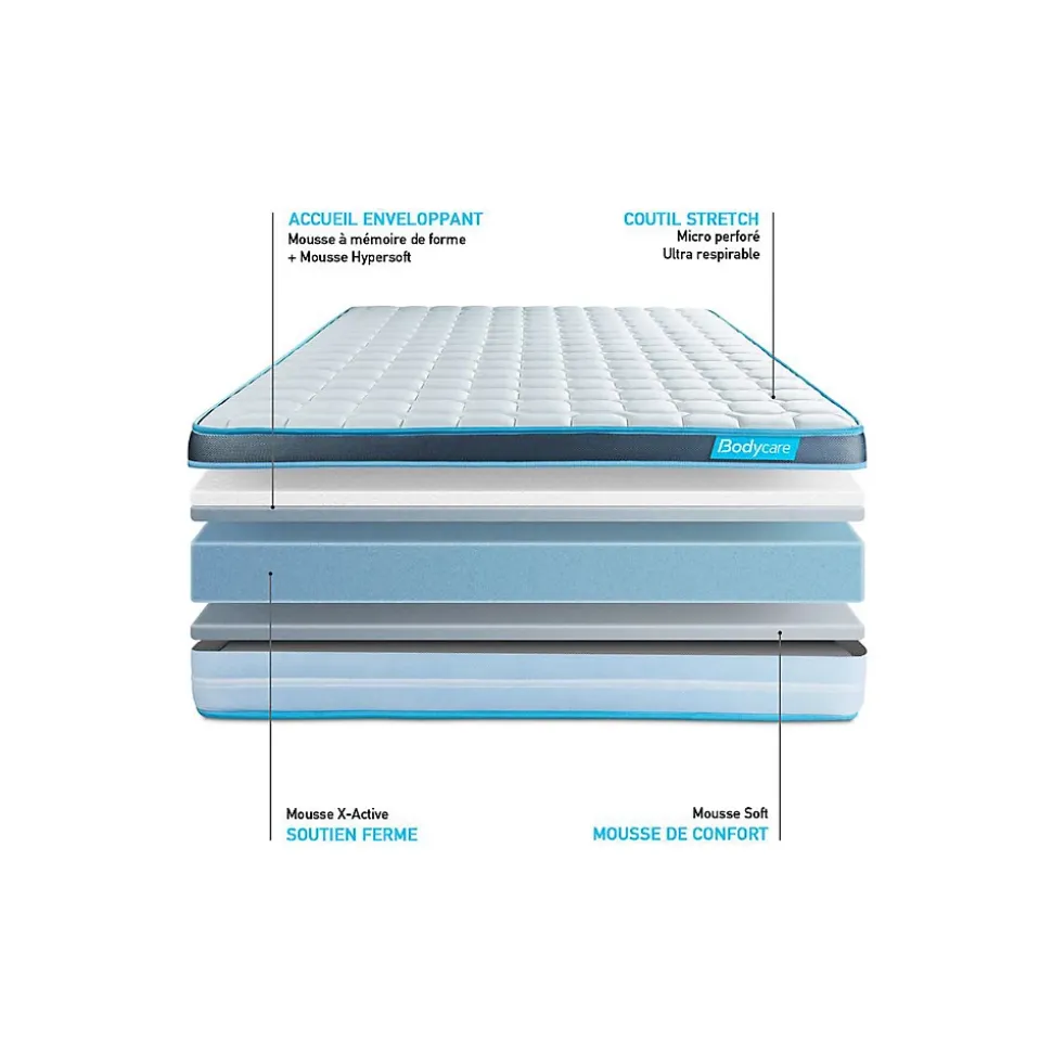 BODYCARE est née de la conviction qu’il n’existe pas de différence entre le corps d’un sportif de haut niveau et celui d’un sportif du quotidien. Pour ces sportifs de haut niveau, comme pour vous, le sommeil est une phase prépondérante dans le processus de récupération physique, nerveuse et psychologique. Nos produits sont conçus en collaboration étroite avec des sportifs. Les matelas BODYCARE allient confort, maintien et souplesse afin de permettre à votre corps de se revitaliser pour récupérer du stress de la journée.Le matelas BodyFit est constitué d’un accueil à mémoire de forme avec un soutien haute densité 5 zones de confort. Il dispose d’une maxi épaisseur de 24cm et est doté d’un coutil microperforé ultrarespirable.- Type de matelas : Mémoire de forme- Epaisseur : 24 cm- Confort : ferme- Accueil : Enveloppant avec 2,5 cm de mousse polyuréthane à mémoire de forme + soft- Soutien : 16cm de mousse polyuréthane haute densité- Indépendance de couchage : Excellente- Coutil : 100% polyester Micro perforé ultra-respirable- Bande latérale : 100% polyester Micro perforé ultra-respirable- Face de couchage : Réversible- Densité : 55 kg/m3- Certification : Oeko-Tex – Type de matelas : Mémoire de forme- Epaisseur : 24 cm- Confort : ferme- Accueil : Enveloppant avec 2,5 cm de mousse polyuréthane à mémoire de forme + soft- Soutien : 16cm de mousse polyuréthane haute densité- Indépendance de couchage : Excellente- Coutil : 100% polyester Micro perforé ultra-respirable- Bande latérale : 100% polyester Micro perforé ultra-respirable- Face de couchage : Réversible- Densité : 55 kg/m3- Certification : Oeko-Tex