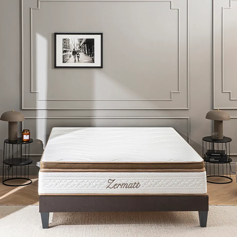 CARACTERISTIQUES :Dimensions disponibles (cm) : 90×190 – 90×200 – 140×190 – 140×200 – 160×200 – 180×200 – 200x200Epaisseur : 31 cmTechnologie : Mémoire de forme Accueil : EnveloppantSoutien : FermeIndépendance de couchage : ExcellenteAération : ExcellenteFabrication : FrançaiseDéhoussable : Topper Oui – Matelas NonConditionnement : A platGarantie : 10 ansCOMPOSITION :Âme intérieure du matelas (CertiPUR) : 20 cm de mousse Haute Résilience 43 kg/m³ (matelas) + 8 cm de mousse viscoélastique à mémoire de forme 60 kg/m³ (topper)Coutil supérieur (Oeko-Tex): Tissu 3D + 4 poignées (matelas) – Face Hiver en tissu stretch polyester et cachemire / Face Eté en tissu 3D et plate-bande d’aération 3D (topper)POINTS FORTS :Ergonomie : La mousse viscoélastique à mémoire de forme du topper s’adapte à chaque morphologie, permettant une meilleure circulation sanguine ainsi qu’une réduction des douleurs dorsales et articulaires.Indépendance de couchage : La mousse viscoélastique à mémoire de forme évite toute transmission de mouvement, vous garantissant un sommeil plus paisible.Fermeté équilibrée : Accueil enveloppant en surface et soutien ferme en profondeur.Faces climatiques : Le topper possède une face été en tissu 3D (aération de la surface de couchage) et une face hiver en cachemire (fibre isotherme qui conserve la chaleur), assurant un confort toute l’année.Hygiène : Le matelas dispose d’une excellente aération, gage d’une meilleure hygiène et durée de vie de votre literie.
