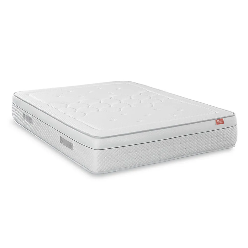 Le matelas Royal Deluxe issu de notre gamme Premium est recommandé aux clients exigeants qui recherchent un matelas dont la fermeté soutient parfaitement le corps tout en offrant une excellente adaptabilité. Il est doté d’un noyau en mousse haute résilience associé à une mousse profilée et un système viscoélastique. Ce système améliore la circulation de l’air à l’intérieur du matelas réduit les points de pression et assure un bon alignement de la colonne vertébrale quelle que soit la position de sommeil. Ce matelas réduit également l’accumulation de chaleur.Caractéristiques du produitLe bloc de mousse assure la fermeté pour une meilleure adaptation au corps et au poids exercé.Le tissu tricoté extensible et épais est respirant.La mousse profilée offre un confort inégalé et améliore considérablement la circulation de l’air.La mousse viscoélastique réduit les points de pression.Le renfort de stabilité en mousse HR35 assure une adaptation et une répartition parfaites de la pression.La bande de tissu respirant favorise la régulation de la température et la circulation de l’air.Hauteur +/- 30 cm