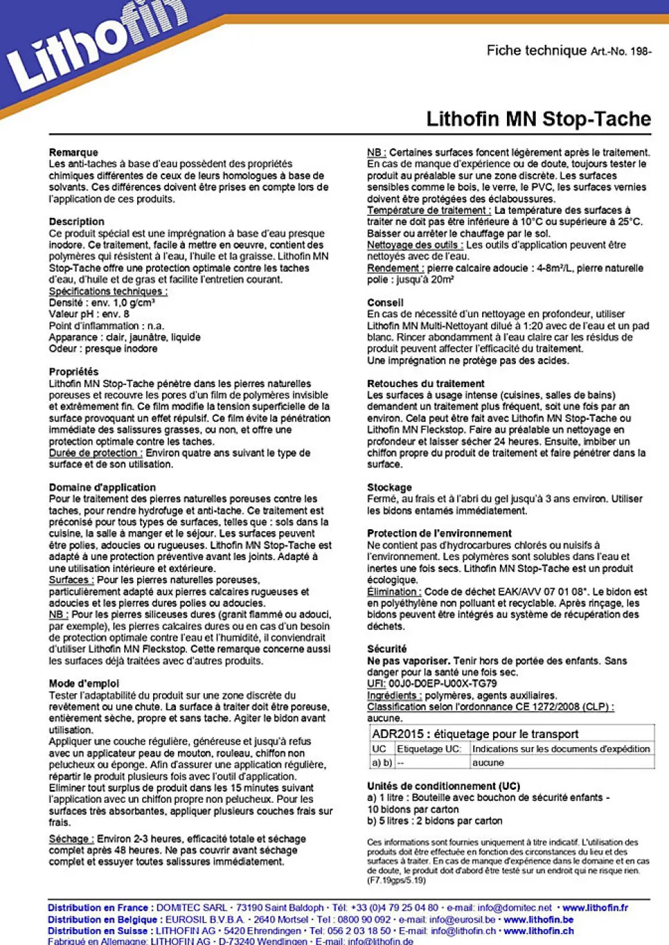 MN Vlekstop Eco – Anti-tache pour pierres calcaires – LithofinCe produit est une imprégnation spéciale pour des sols en pierres calcaires poreuses.Ce produit spécial est une imprégnation à base d’eau presque inodore.Lithofin MN Stop-Tache offre une protection optimale contre les taches d’eau, d’huile et de gras et facilite l’entretien courant.Lithofin MN Stop-Tache pénètre dans les pierres naturelles poreuses et recouvre les pores d’un film de polymères invisible et extrêmement fin.Ce film modifie la tension superficielle de la surface provoquant un effet répulsif.Ce film évite la pénétration immédiate des salissures grasses, ou non, et offre une protection optimale contre les taches. Spécifications techniques :Densité : env. 1,0 g/cm³Valeur pH : env. 8Point d’inflammation : n.a.Apparance : clair, jaunâtre, liquideOdeur : presque inodoreDomaine d’application :Pour le traitement des pierres naturelles poreuses contre les taches, pour rendre hydrofuge et anti-tache. Ce traitement est préconisé pour tous types de surfaces, telles que : sols dans la cuisine, la salle à manger et le séjour. Les surfaces peuvent être polies, adoucies ou rugueuses.Lithofin MN Vlekstop Eco est adapté à une protection préventive avant les joints. Adapté à une utilisation intérieure et extérieure.Surfaces : Pour les pierres naturelles poreuses, particulièrement adapté aux pierres calcaires rugueuses et adoucies et les pierres dures polies ou adoucies.Rendement :pierre calcaire adoucie : 4-8 m²/Lpierre naturelle polie : jusqu’à 20 m²