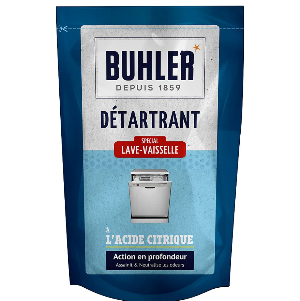 Buhler – Nettoyant détartrant lave-vaisselle (200 g) Assurez une hygiène parfaite de votre lave-vaisselle avec ce nettoyant Buhler. Sa formule à base d’acide citrique dissout efficacement les dépôts de calcaire et élimine les résidus incrustés dans les parties vitales de l’appareil. Idéal pour maintenir l’efficacité de lavage, éliminer les traces blanches et prolonger la durée de vie de votre appareil. Mode d’emploi : vider le lave-vaisselle et nettoyer le filtre, verser la totalité du sachet dans le bac à produit, programmer un cycle de lavage normal à 60 °C sans prélavage, sans ajouter de produit de lavage. Contenance : 200 g. Produit dangereux – respecter les précautions d’emploi