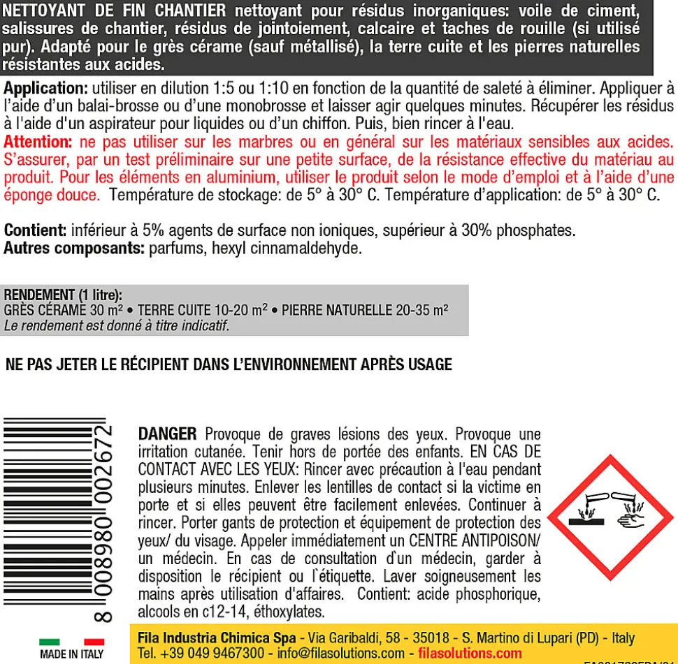 NETTOYANT DE FIN CHANTIER 1L, élimine les résidus et les salissures de chantier, le calcaire et la rouille. Élimine les efflorescences salines de la terre cuite. Nettoyant pour résidus inorganiques: résidus de jointoiement, dépôts de calcaire et taches de rouille. Nettoie en profondeur les sols extérieurs. Adapté pour le grès cérame (sauf métallisé), la terre cuite et les pierres naturelles résistantes aux acide. Acide tamponné, ne dégage pas de fumées nocives pour l’opérateur et pour l’environnement. Ne modifie pas l’aspect et la couleur des matériaux. Respecte les joints. N’endommage pas les profilés et les éléments en aluminium et en acier.