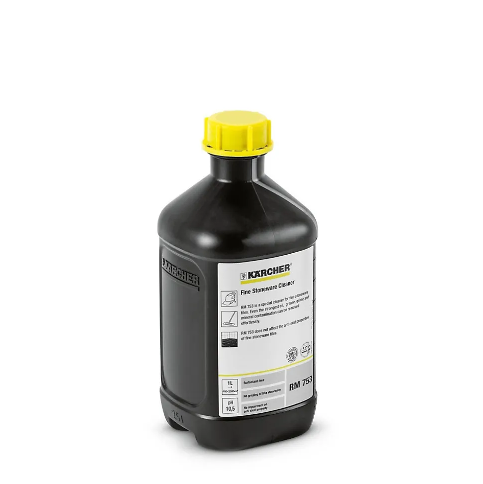 Nettoyant RM 753 Karcher, bidon 2,5 L (réf. 62955870), pH 10, formulé pour enlever huile, graisse et suie sur grès cérame.