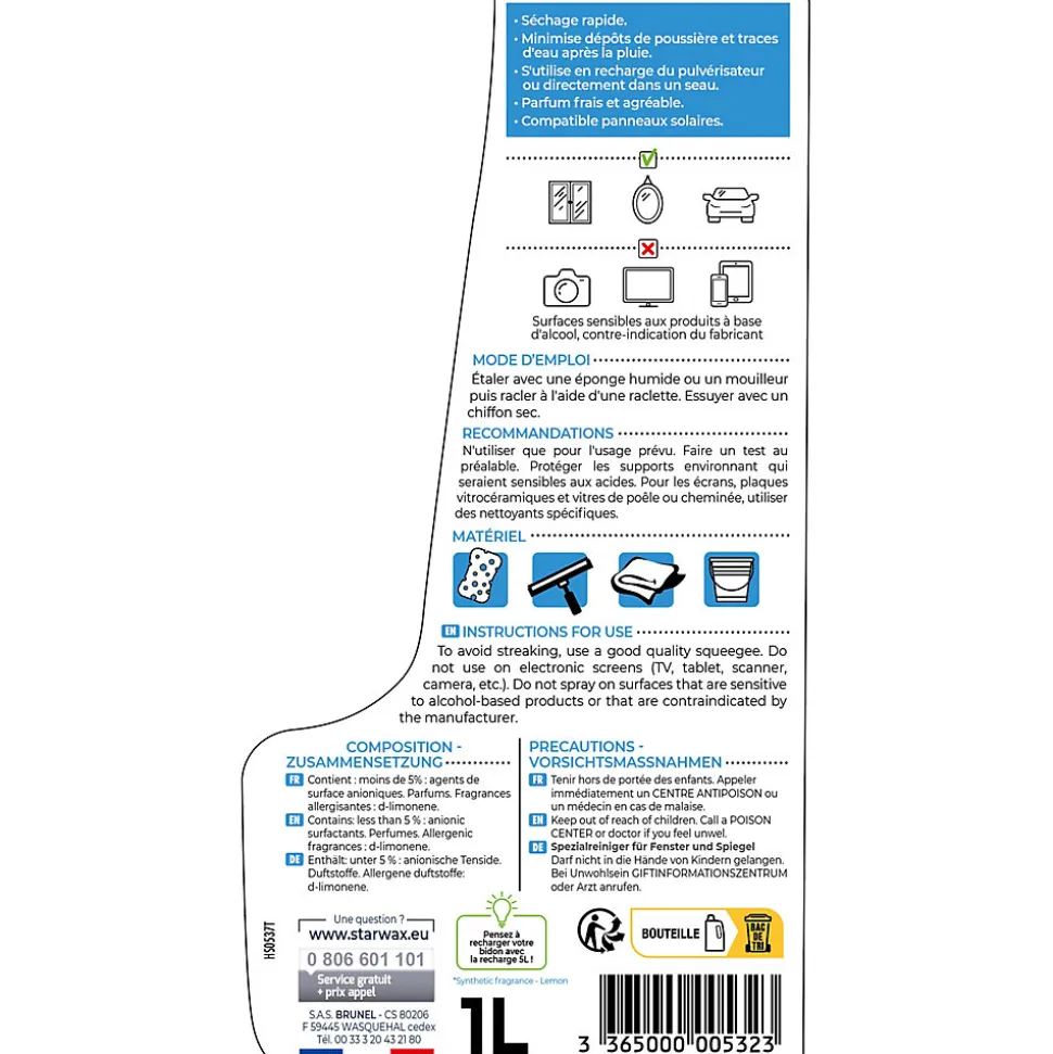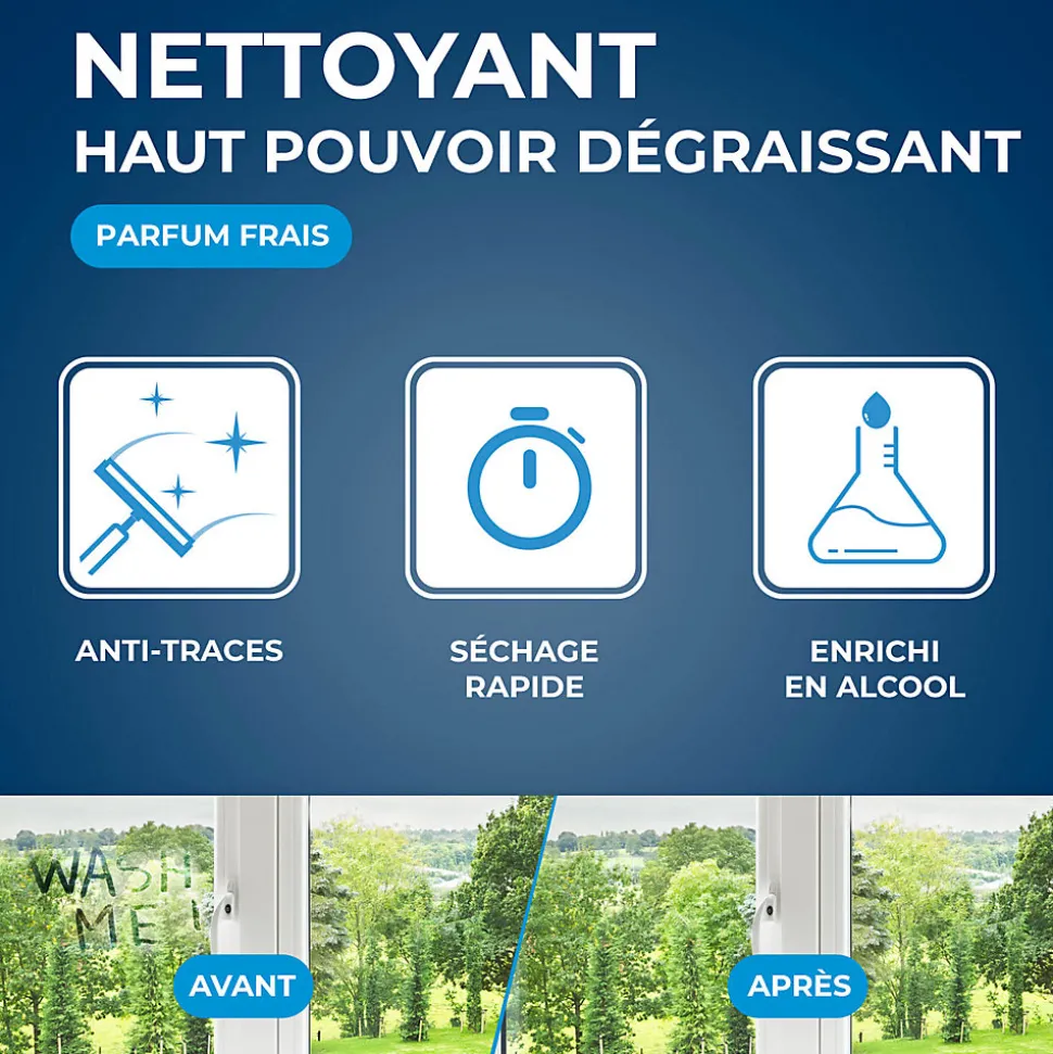 La forte concentration en alcool qui permet un dégraissage rapide.Son parfum frais et agréable.Le format qui permet de recharger un pulvérisateur. Le produit permet de dégraisser et de nettoyer vos vitres sans laisser de trace. Sa texture permet d’adhérer à la vitre pour enlever les saletés. Sa formule retarde la formation de buée, minimise le dépôt de poussière et les traces d’eau après la pluie