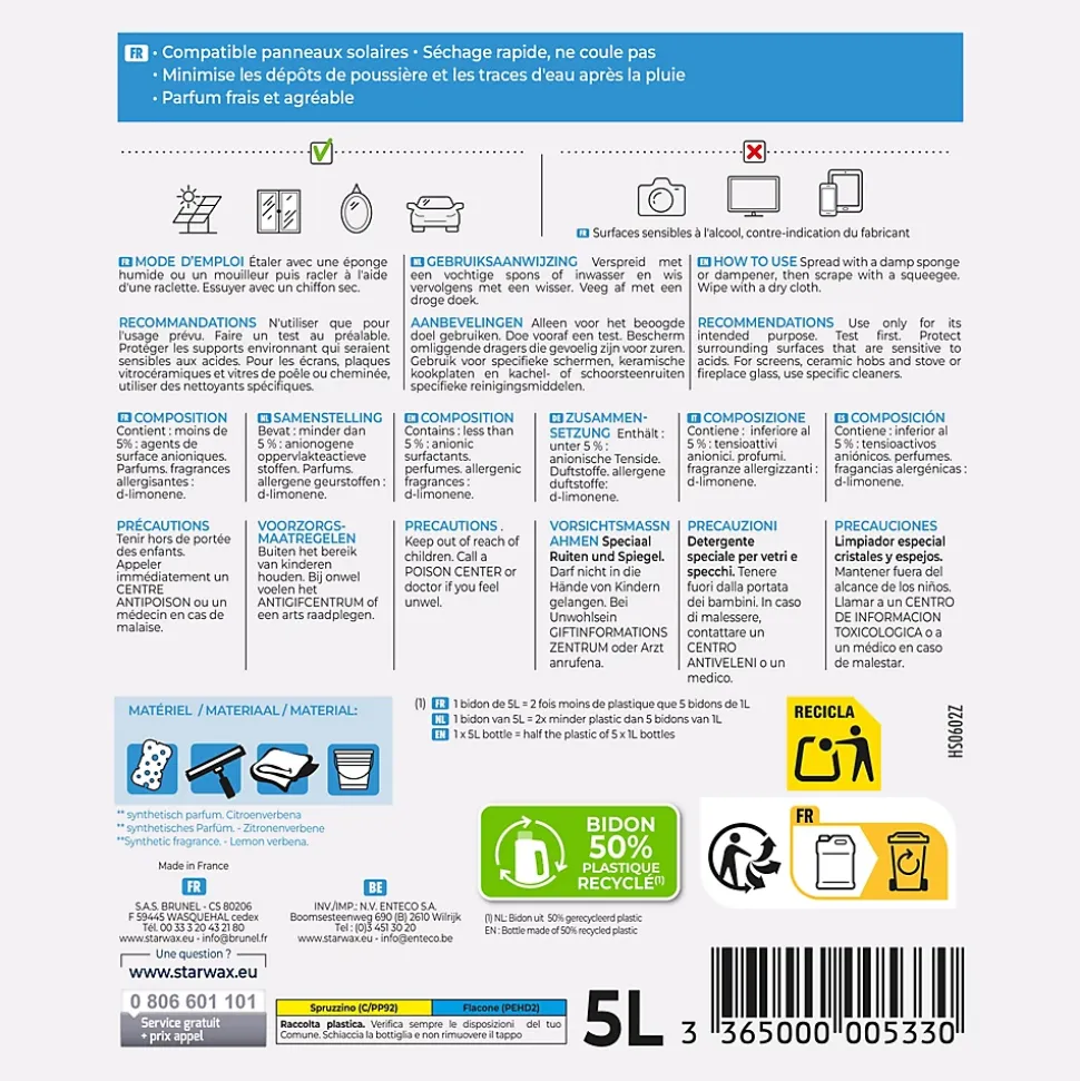Forte concentration en alcool qui permet un dégraissage rapide.Parfum frais et agréable.Format qui permet de recharger un pulvérisateur. Le produit permet de dégraisser et de nettoyer vos vitres sans laisser de trace. Sa texture permet d’adhérer à la vitre pour enlever les saletés. Sa formule retarde la formation de buée, minimise le dépôt de poussière et les traces d’eau après la pluie