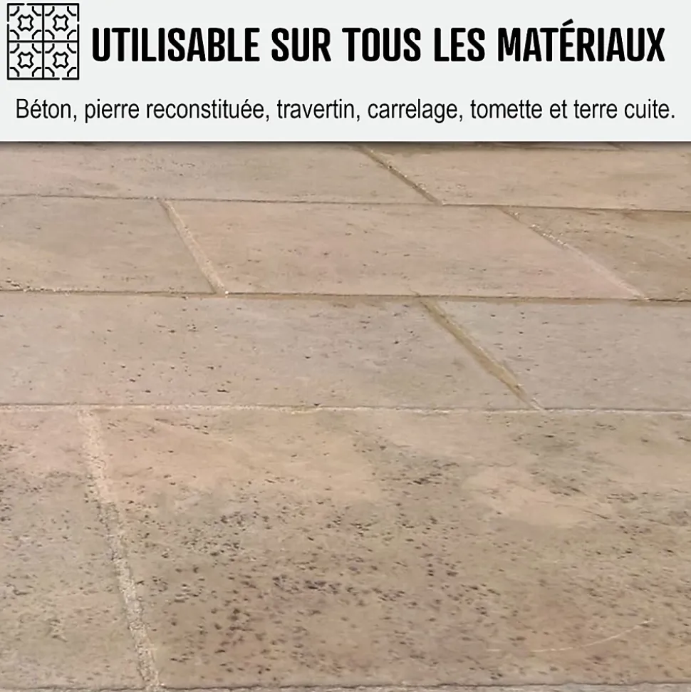 Nettoyant spécial pour sol de terrasse à action ultra rapide. Action curative et immédiate sur les algues et lichens. Nettoie, désincruste et décontamine. Application par pulvérisation. Pour les terrasses en pierre, béton, tomette, carrelage, travertin, terre cuite.CONSOMMATION1 L traitera :4 à 6 m² de surface si le produit est utilisé pur pour un support très encrassé.8 à 12 m² de surface si le produit est utilisé à 50% de dilution pour un support moyennement encrassé.16 à 24 m² de surface si le produit est utilisé à 25% de dilution pour un support peu encrassé.Application : En tant que fabricant Français, nous mettons à disposition un document PDF disponible en bas de page vous indiquant les informations produits ainsi que les consignes d’application.La plateforme ne permet pas encore le regroupement des différents modèles. Pour voir toutes les contenances et toutes les couleurs, tapez ou copier-coller les termes suivants dans la barre de recherche : Nettoyant terrasse professionnel rapide pavé autobloquant pierre béton