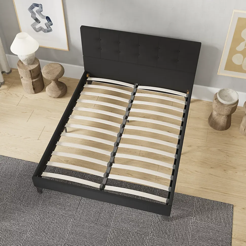 - Description des matériaux : -Le cadre du lit est revêtu d’un tissu de coloris noir, gris, lin ou brun. – Les pieds du lit sont de coloris noir.