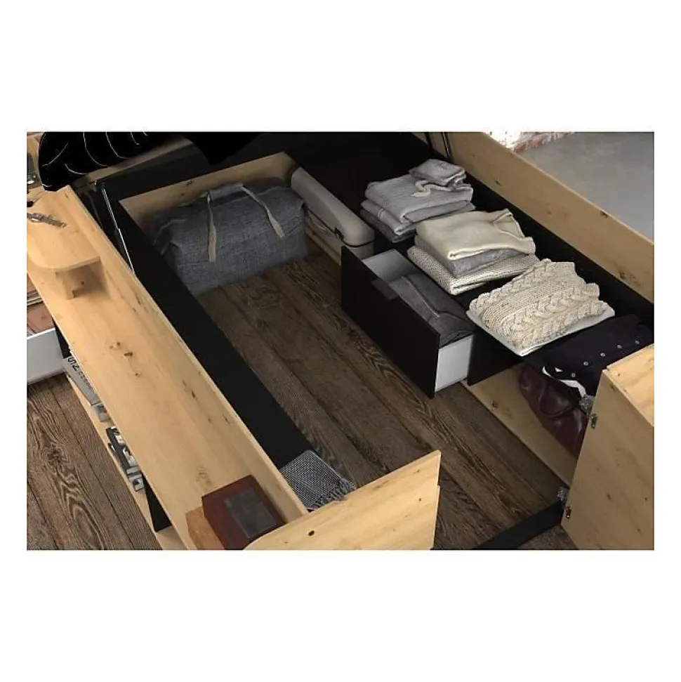 ODYSSEE LIT COFFRE 140X200 adaptable en 190 – avec Sommier Relevable – Aménagement extérieur: 1 porte, 1 tablette, 1 tiroir, 2 niches – Aménagement intérieur: Tablettes, niches et 1 tiroir – panneau de particules revetu papier décor Chene Artisan et Noir – Dimensions LXHXP: 166.2X66.5X205.8