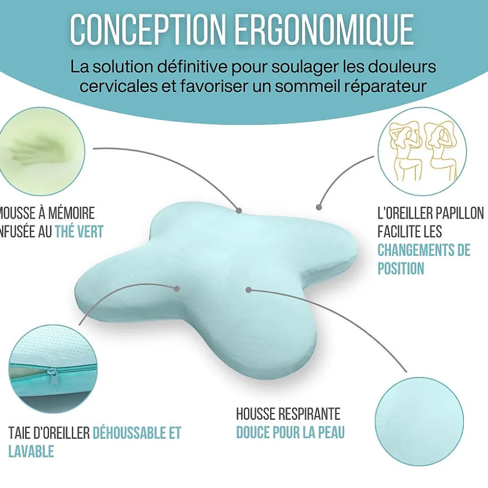 Dormez paisiblement avec cet oreiller papillon qui allie confort et ergonomie pour un sommeil réparateur. Sa conception unique facilite le changement de position et offre un excellent soutien cervical. Grâce à son infusion de thé vert, il procure une sensation apaisante et rafraîchissante. Son revêtement respirant et son gel thermorégulateur assurent une température idéale toute la nuit.