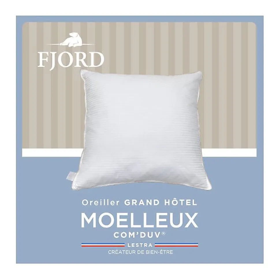Oreiller Fjord Grand Hotel Moelleux Com’Duv satin de coton rayé Lestra. Garnissage COM’DUV 100% polyester siliconé, enveloppe 100% coton satin rayé, finition passepoil champagne. Disponible en 65 x 65 cm (800 g) et 50 x 70 cm (600 g). Certifié OEKO-TEX. Fabriqué en France. Livré sous valise intissée beige avec leaflet.
