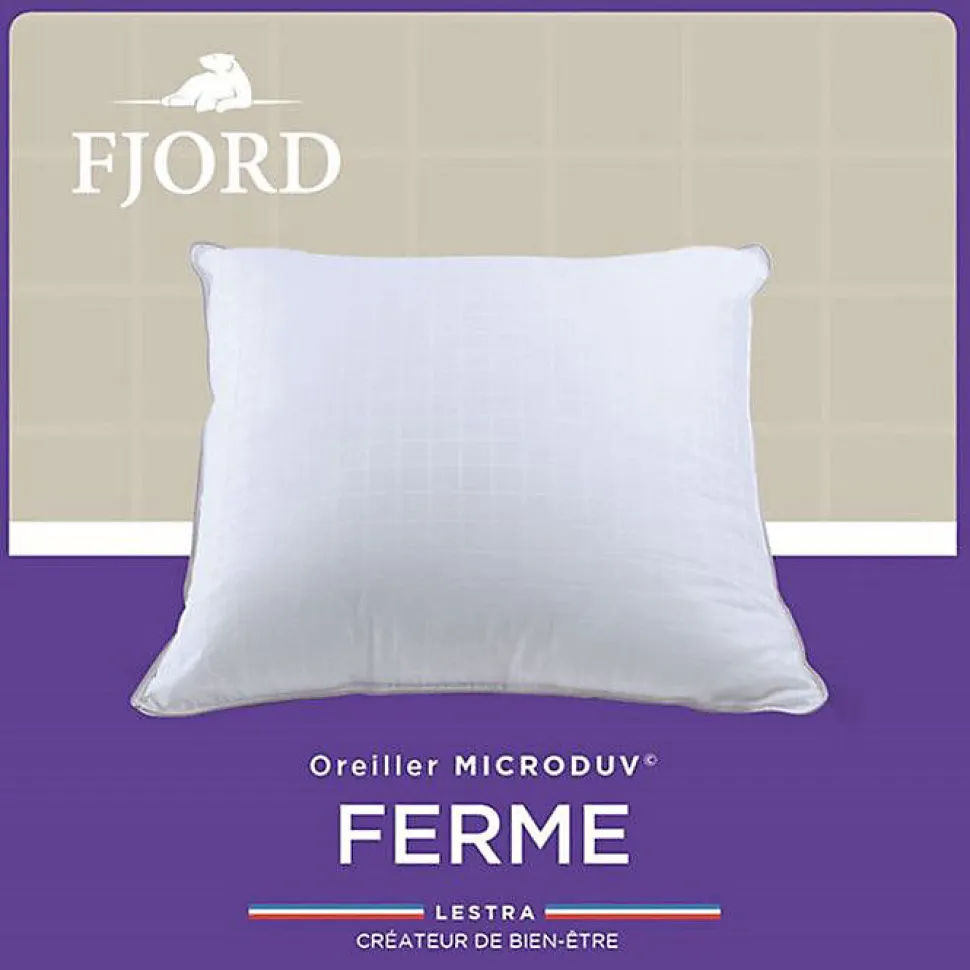 Oreiller Fjord Microduv Lestra : garnissage fibres Microduv effet duvet pour un volume généreux et tenue durable, confort ferme avec accueil très moelleux, enveloppe 100% coton satinée imprimée carreaux non bruyante, lavable à 40°C, fabriqué en France, certifié OEKO-TEX Standard 100.