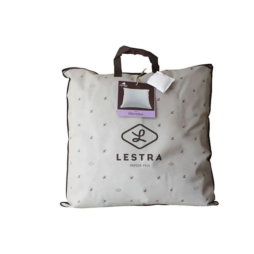 Oreiller Fjord Microduv’ Lestra : garnissage Microduv polyester breveté effet duvet, enveloppe 100% coton satiné, confort moelleux accueil très moelleux, fabriqué en France, certifié OEKO-TEX Standard 100, lavable à 40°C, résistant et anti-acariens. Disponible en 50 x 70 cm et 65 x 65 cm.